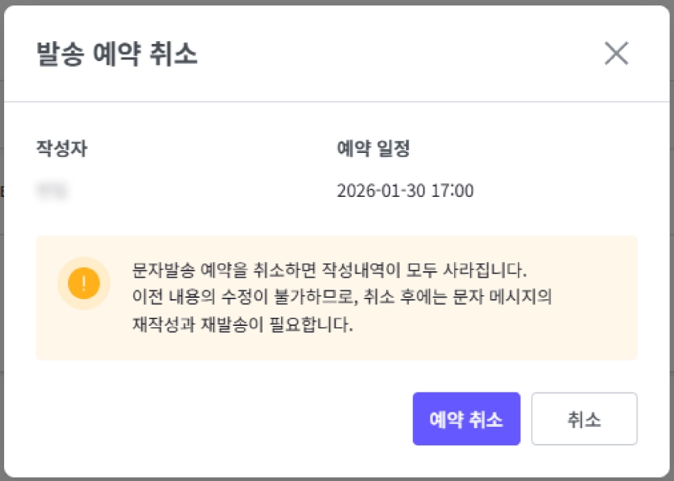 예약 취소 버튼을 클릭하면 작성자, 제목, 예약 일정을 확인하고 예약 발송을 취소할 수 있습니다.