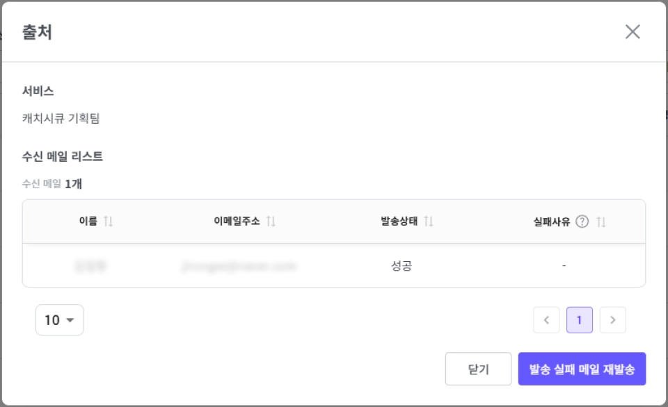 목록에서 ‘출처’를 클릭하면 수신자 목록 및 발송 성공/실패 여부를 확인할 수 있습니다.