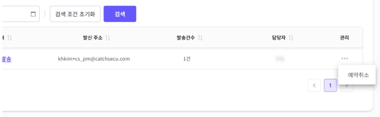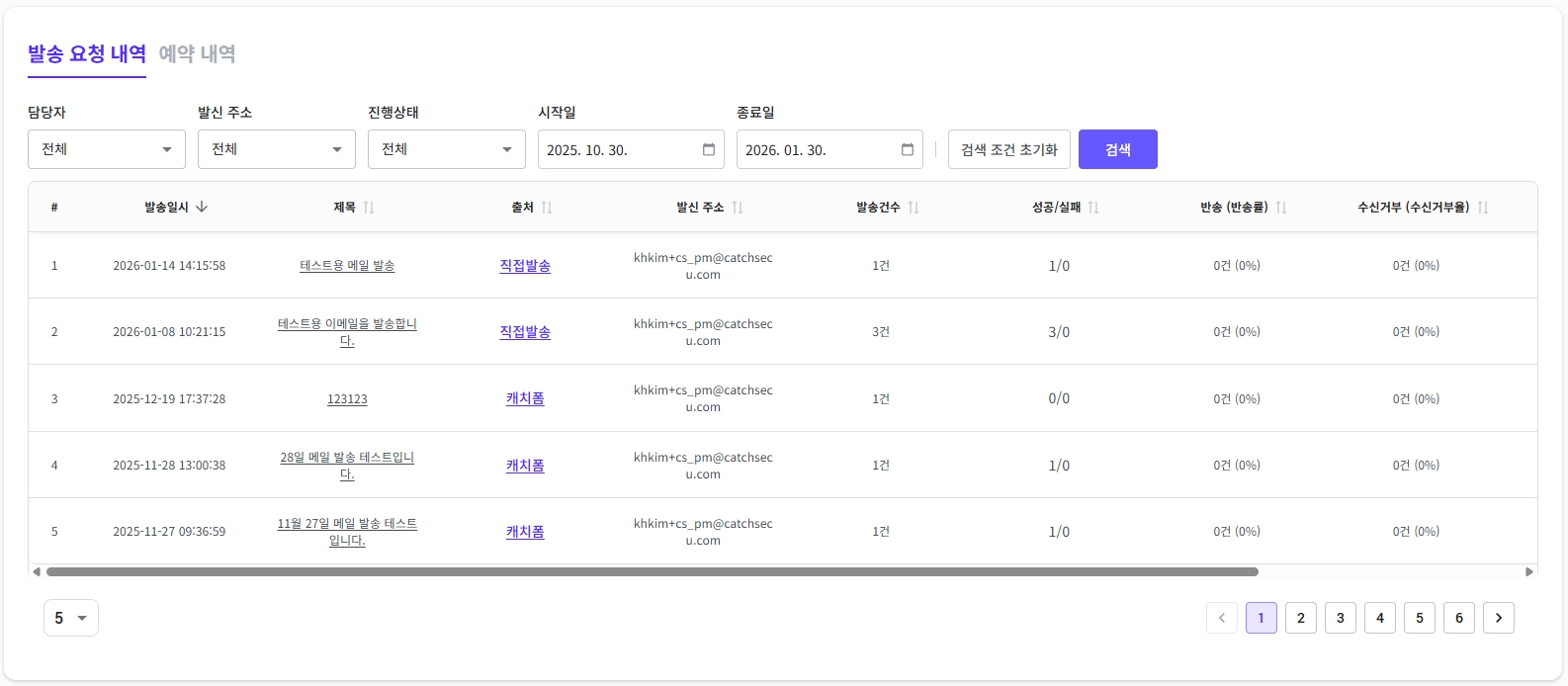 발송 요청 내역은 발신 이메일 주소, 발송 상태, 발송일자 등으로 검색해서 볼 수도 있습니다.