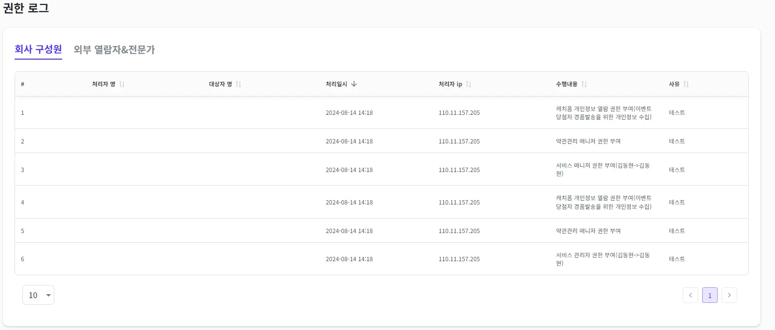 회사 구성원에게 부여한 권한에 따른 처리 로그를 볼 수 있습니다.