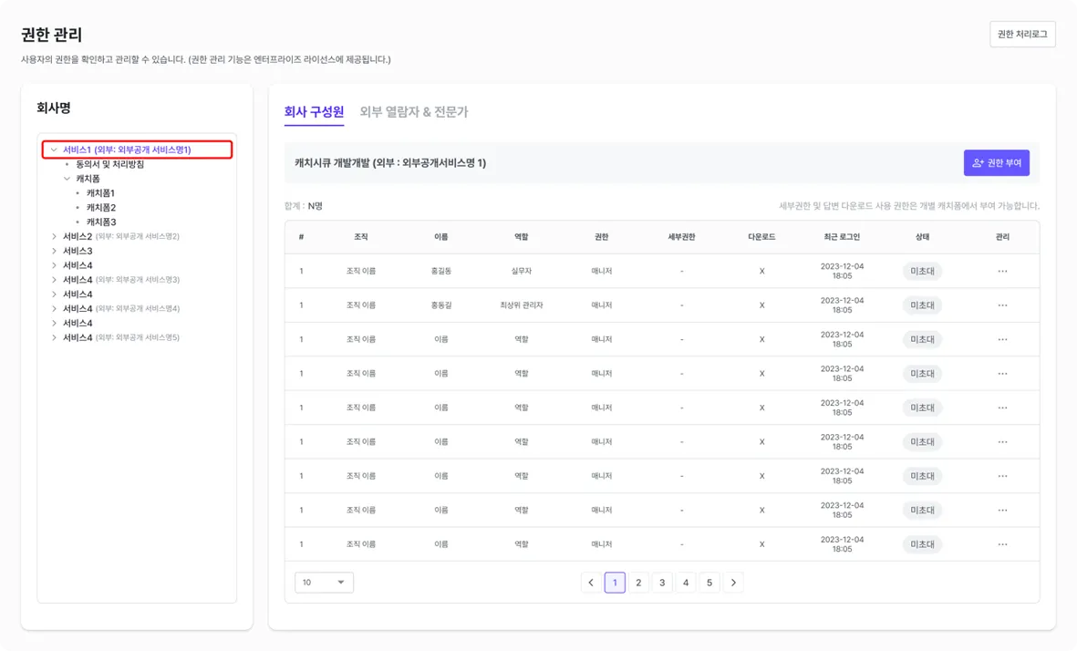 서비스별 권한 부여 및 구성원과 구성원의 권한을 확인할 수 있습니다.