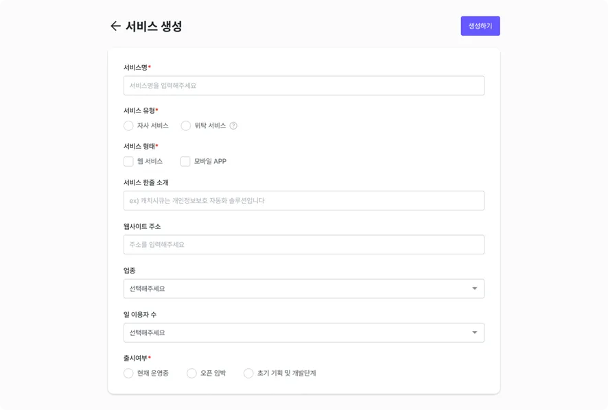 서비스명, 서비스 유형, 서비스 형태, 출시여부는 필수항목입니다.