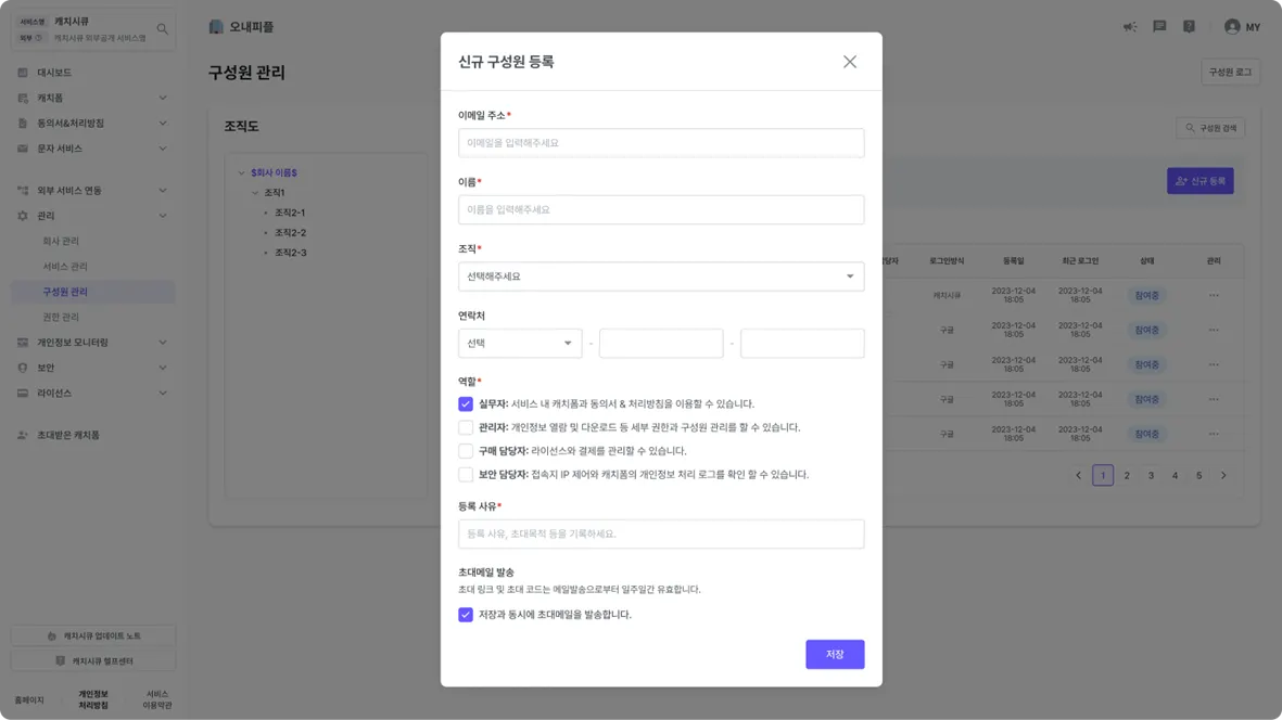 이메일, 이름, 조직, 역할, 등록 사유(필수 항목)를 기재한 후 ‘저장’ 버튼을 클릭해 주세요.