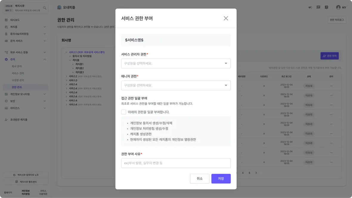 캐치폼별로 권한을 부여하려면 먼저 서비스 권한을 부여해야 합니다.