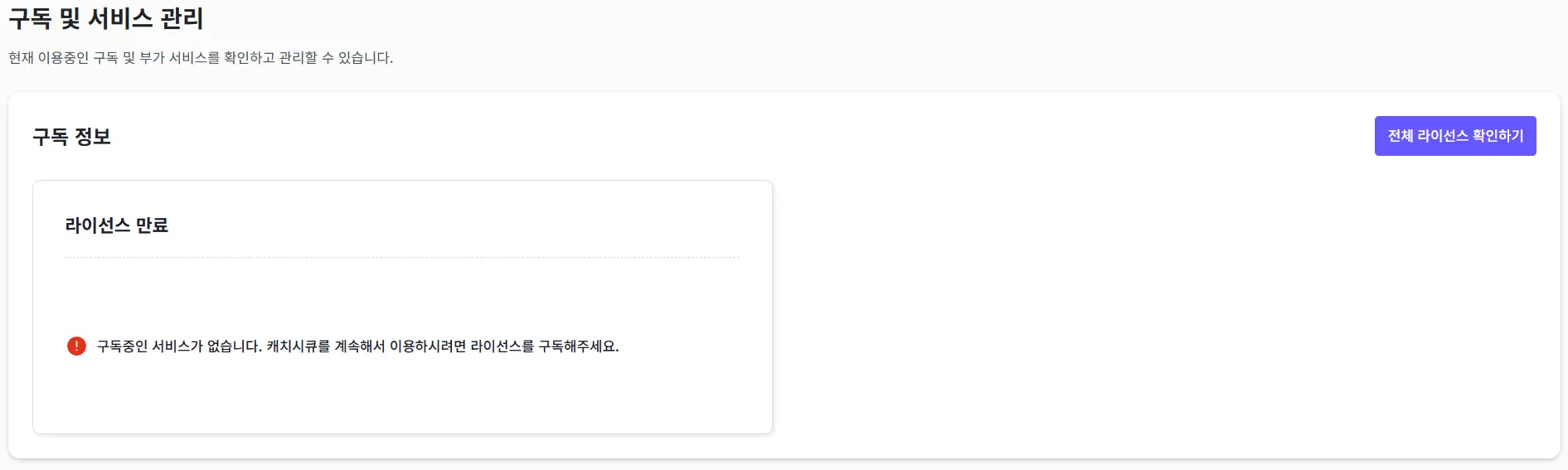 캐치시큐 대시보드에 라이선스 > 구독 및 서비스 관리를 클릭해 주세요.