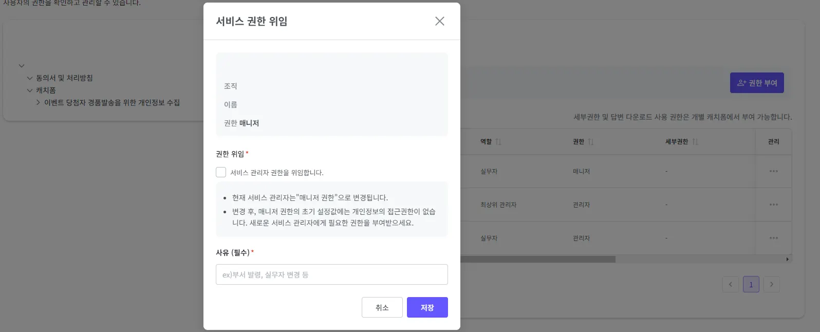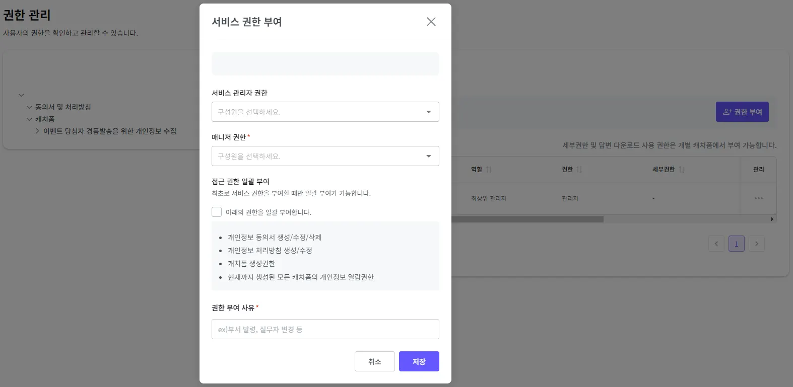 권한 부여 사유를 입력 후 ‘저장’ 버튼을 클릭해 주세요.