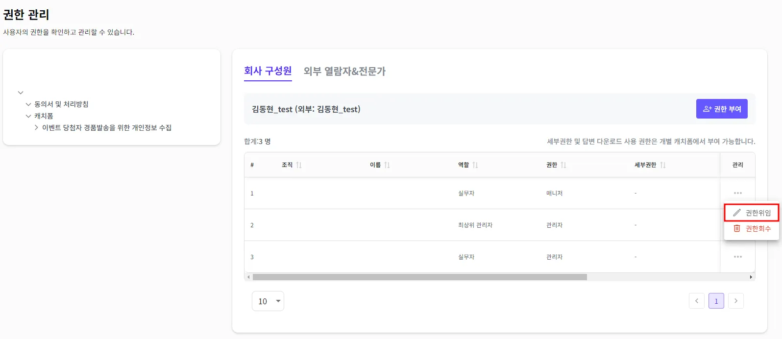 ‘회사 구성원’에서 권한을 위임할 항목의 관리 > 권한 회수를 클릭해 주세요.