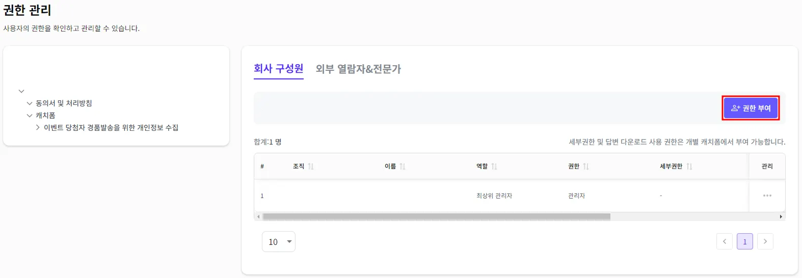 캐치시큐 대시보드에 권한 > 권한 관리를 클릭해 주세요.