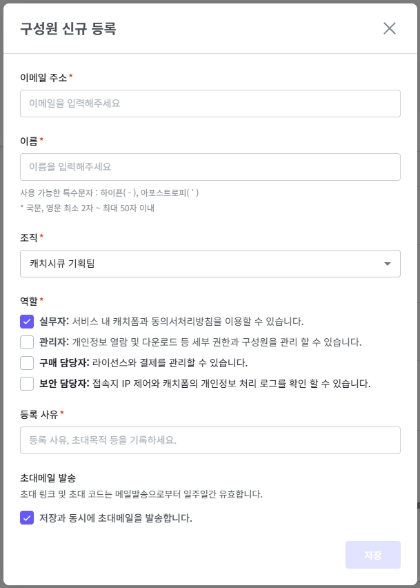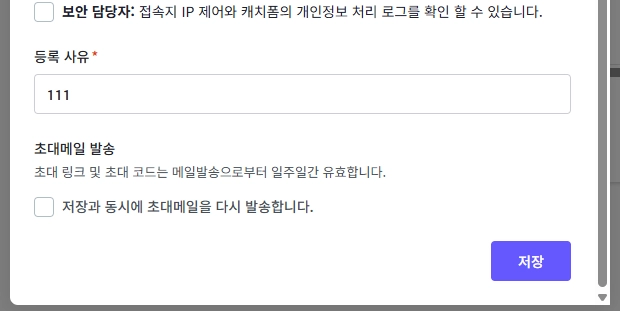 사유를 입력 후 저장합니다. 구성원 초대 메일이 해당 구성원에게 즉시 발송됩니다.