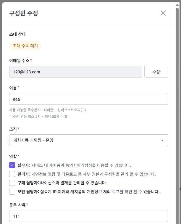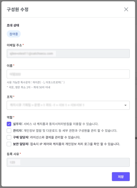 구성원 이메일 및 성함, 조직, 역할, 등록 사유