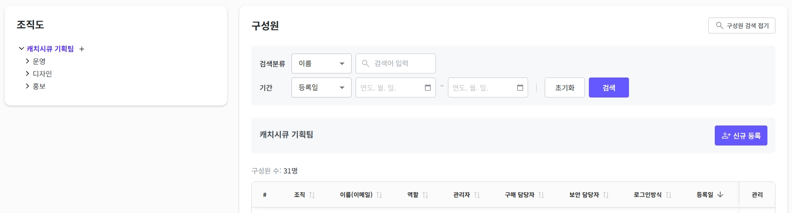구성원의 이름, 이메일, 조직 등으로 검색이 가능합니다. 구성원의 등록일 기준으로도 범위를 변경할 수 있습니다.