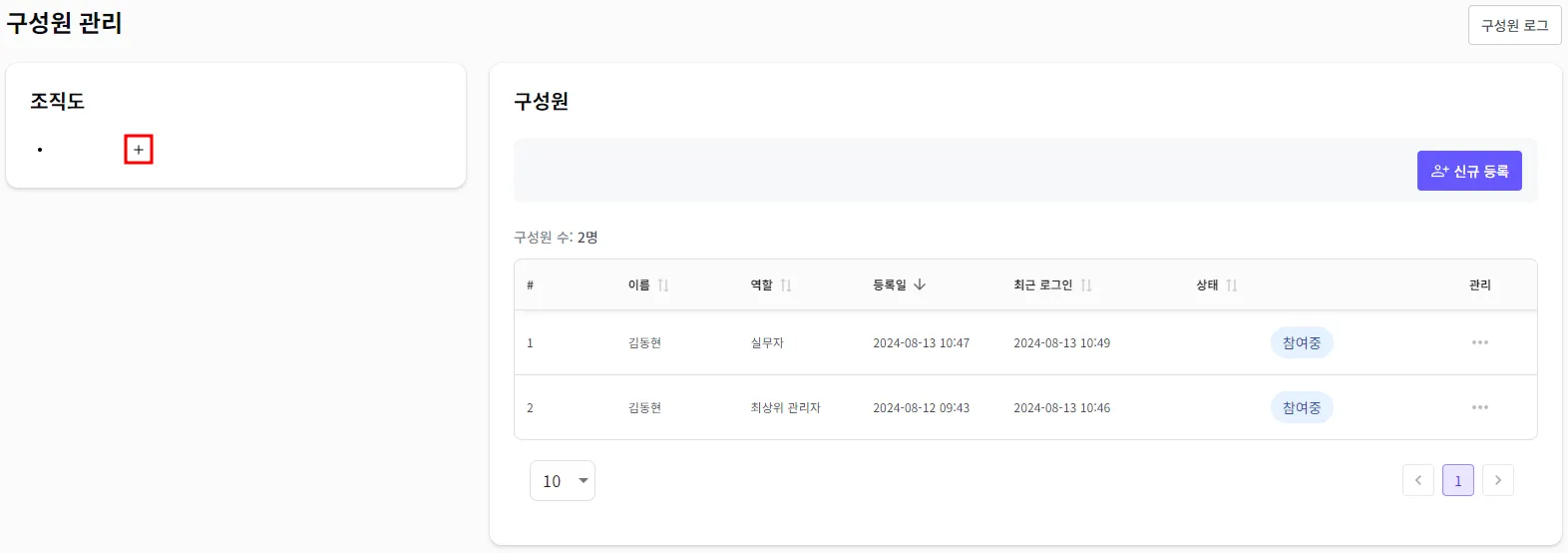 페이지 내 조직도 > + 를 클릭해 주세요.