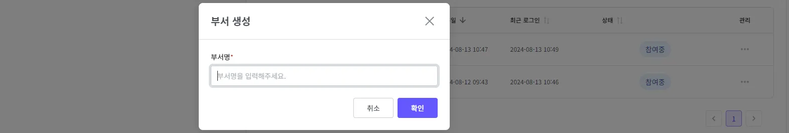 부서명을 입력 후 ‘확인’ 버튼을 클릭해 주세요.