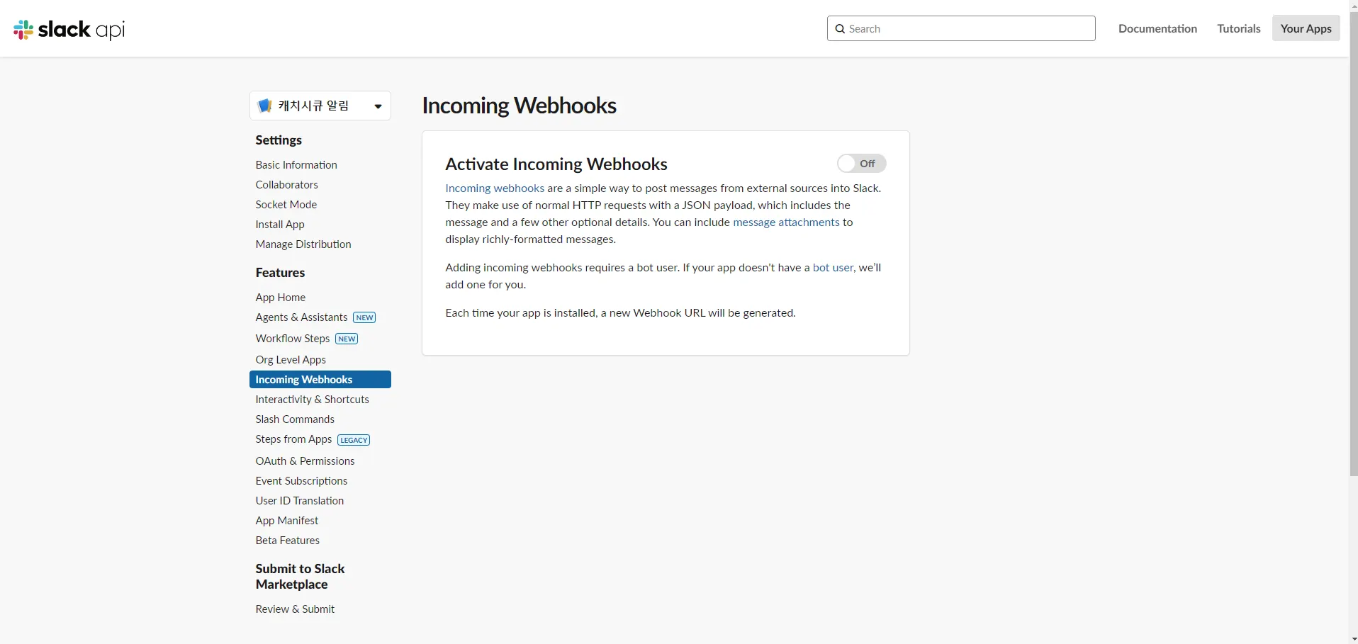 incoming Webhooks를 활성화 합니다.