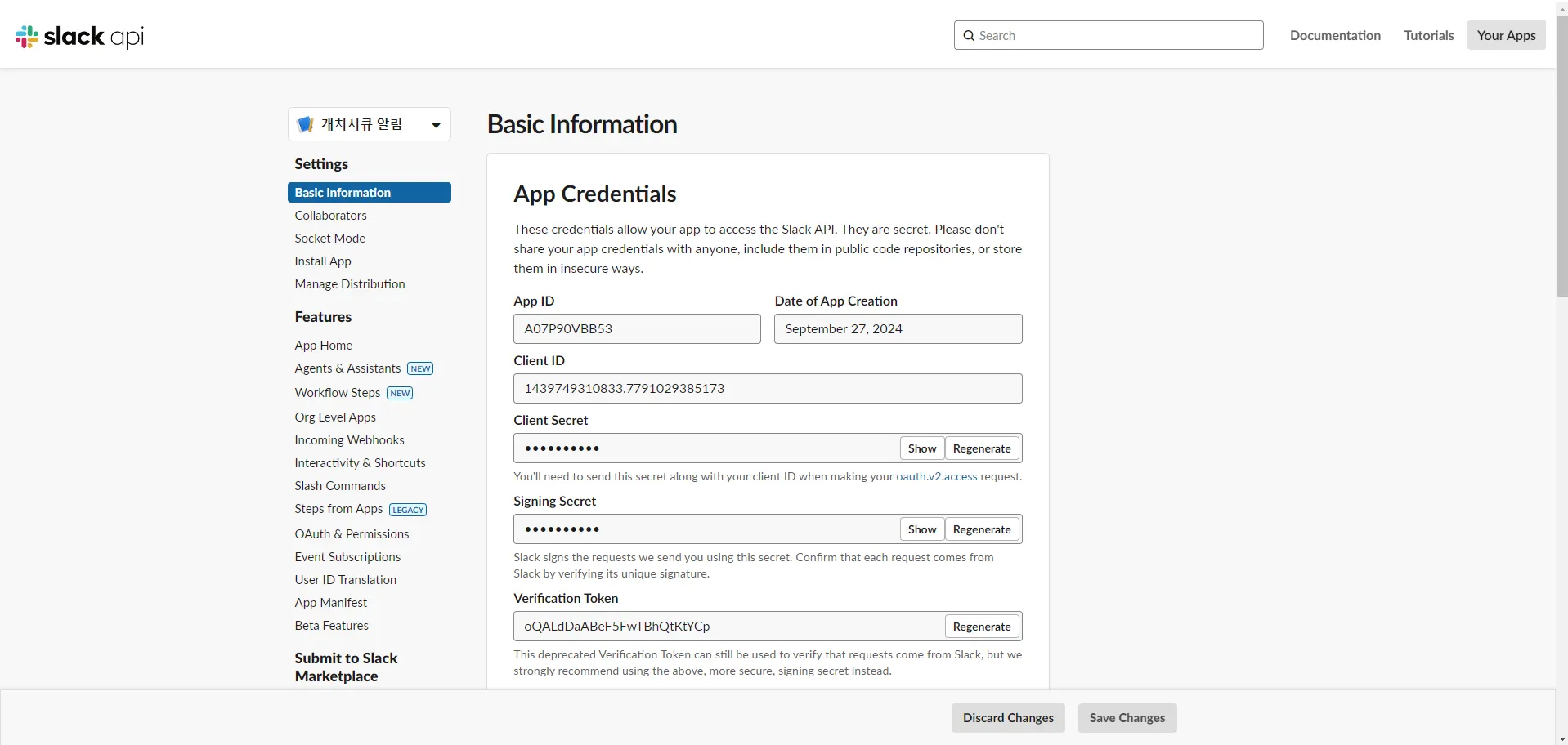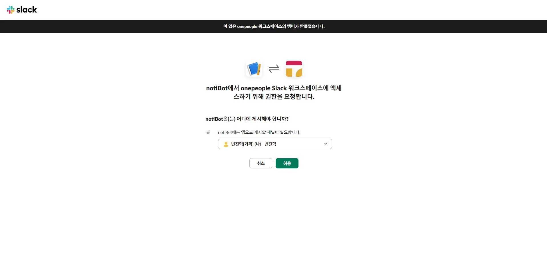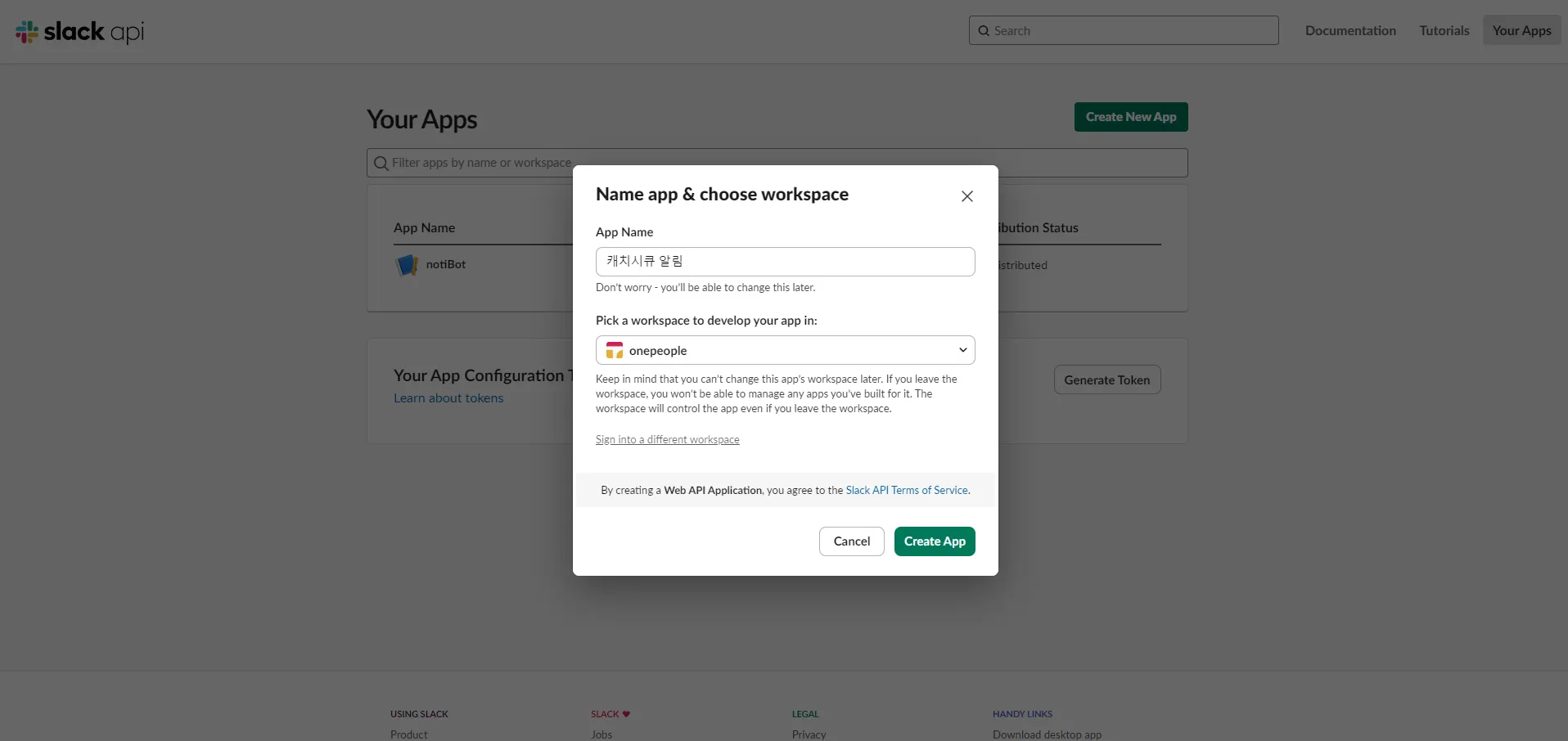 웹훅 APP 이름과 수신 받을 워크스페이스를 선택합니다.