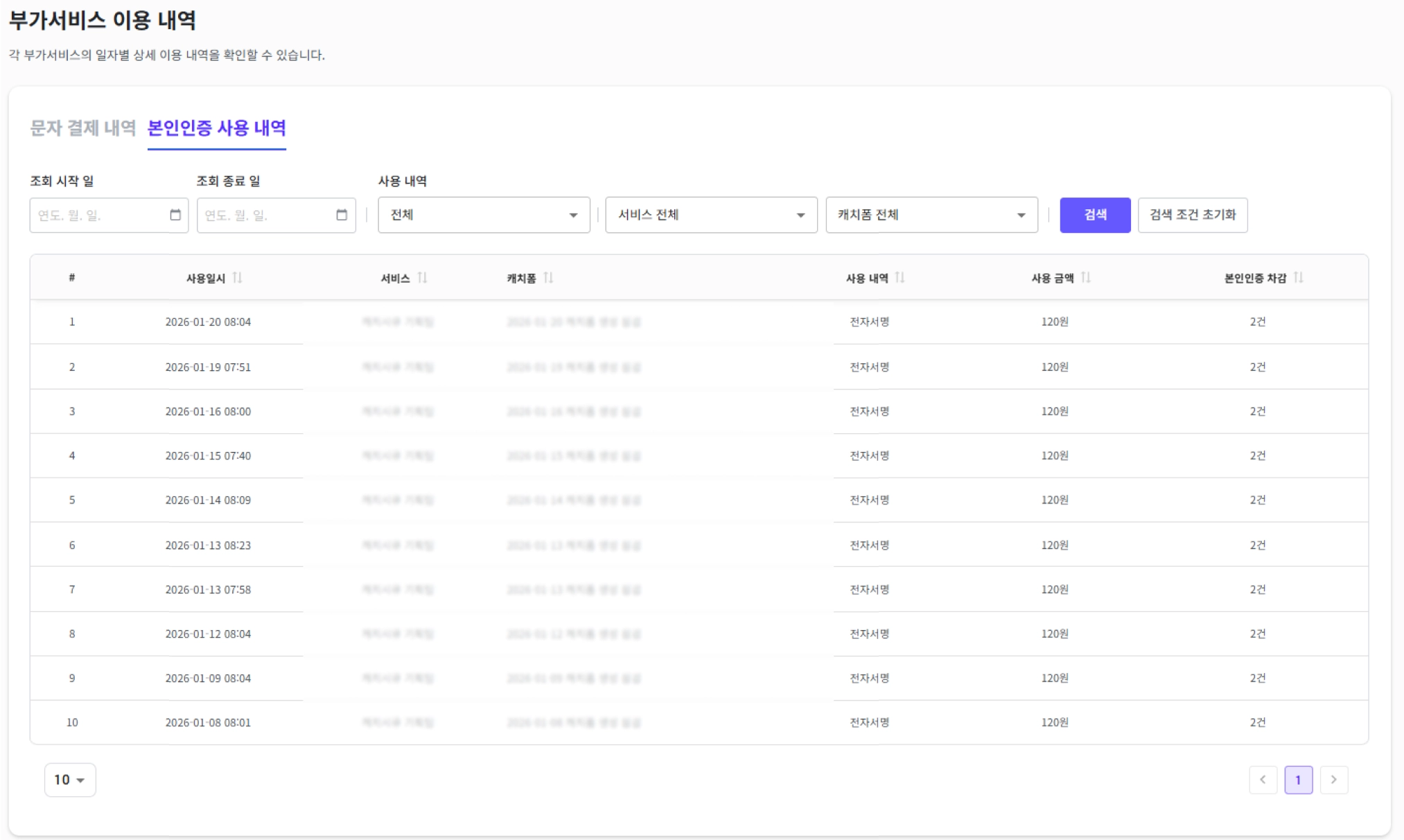 위치: 우측 메뉴 > 라이선스 > 부가서비스 이용 내역 > 본인인증 사용 내역