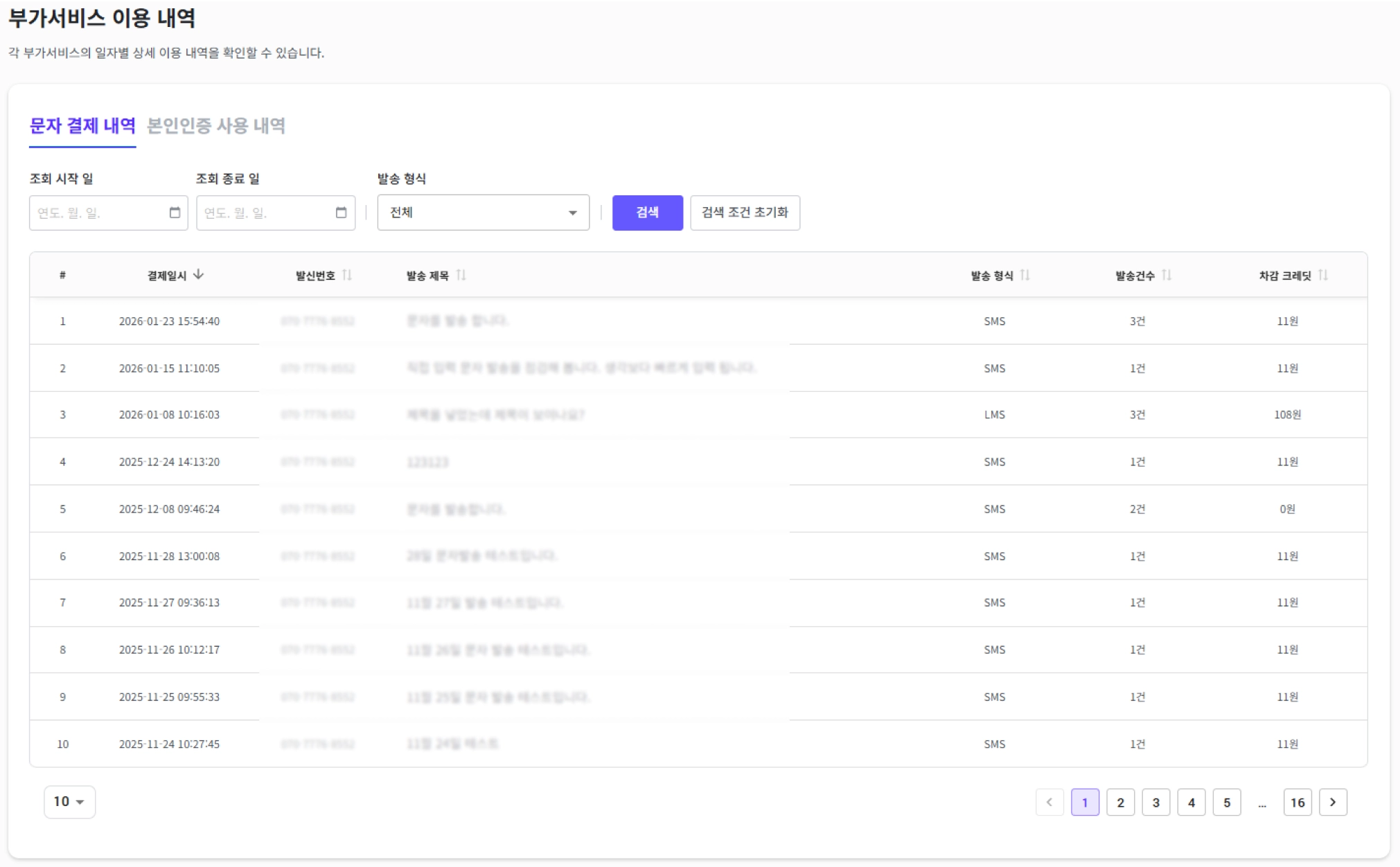 문자 발송 내역 및 발송 건별 차감 크레딧 이력을 확인할 수 있습니다.