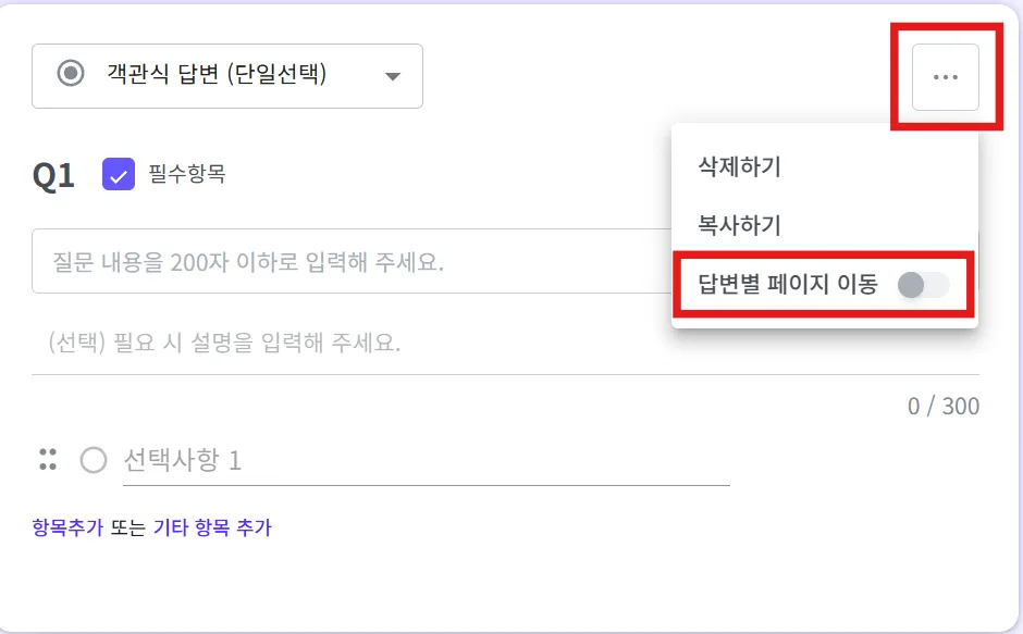네이버 폼의 '답변에 따라 페이지 이동', 구글 폼의 '답변에 따라 섹션으로 이동'과 동일한 기능입니다.