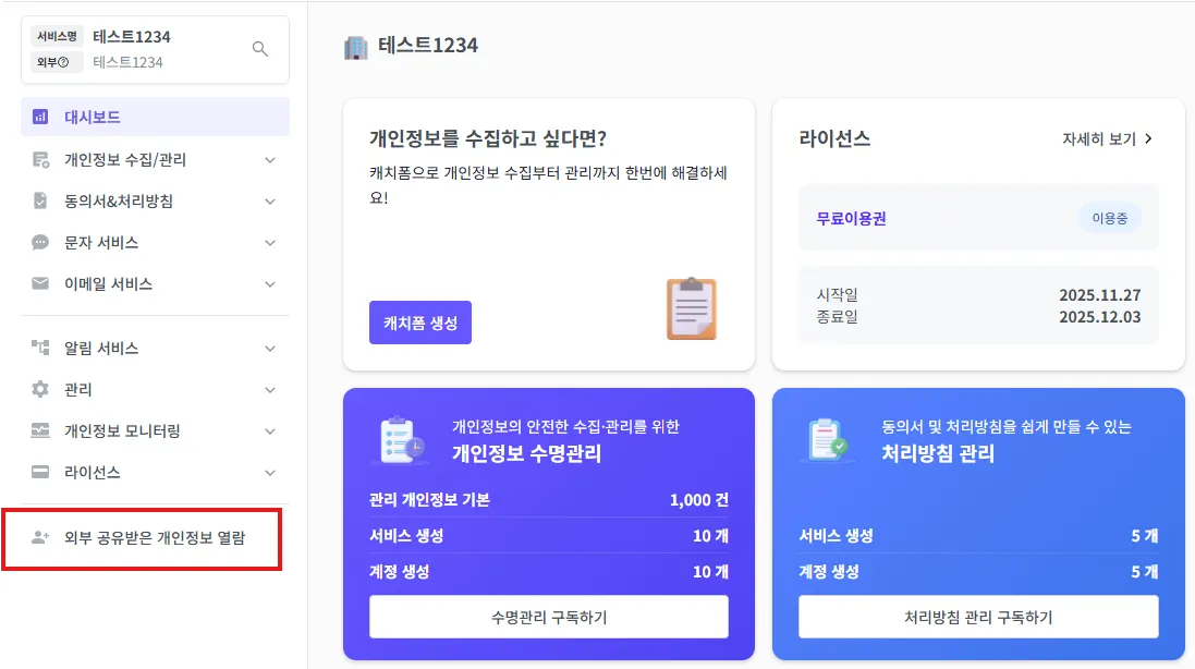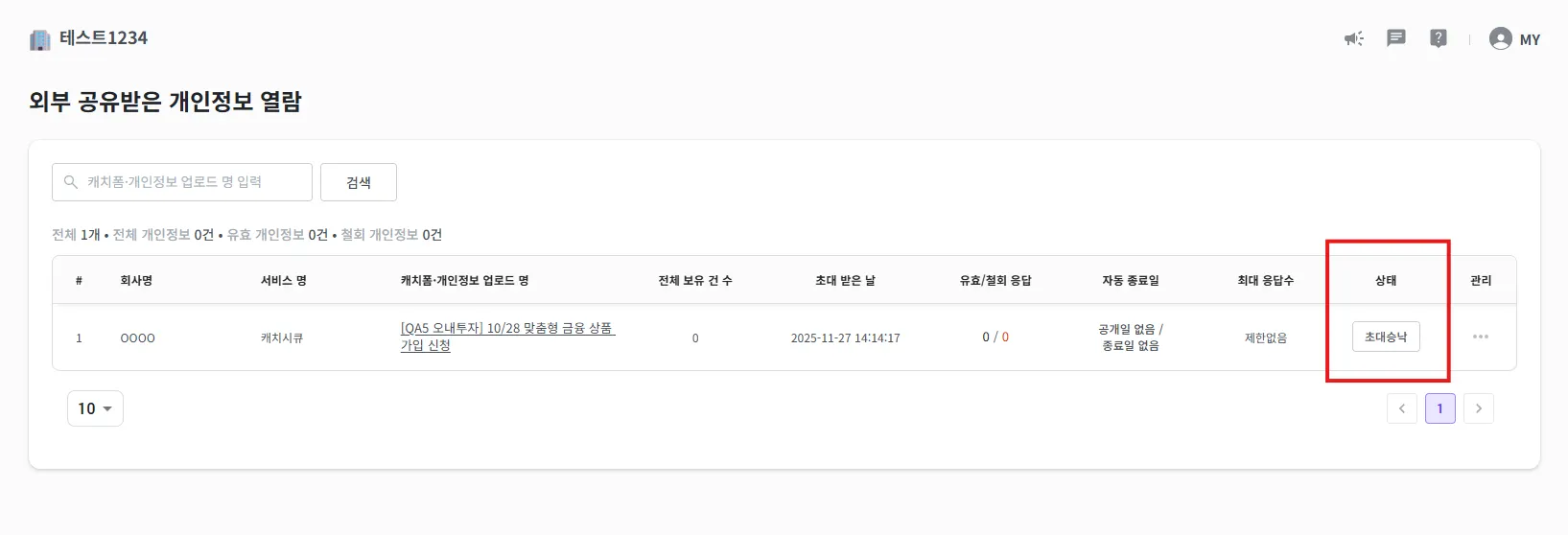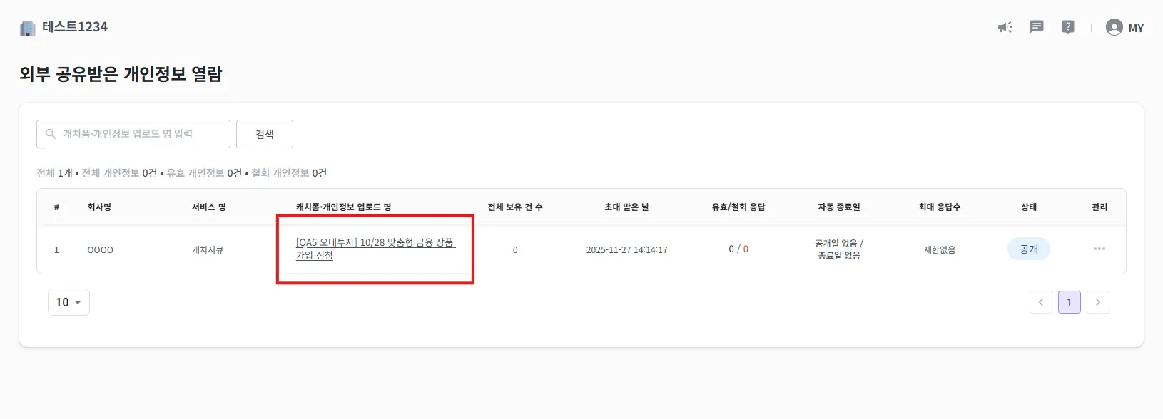 외부 공유받은 개인정보 열람 목록에서 초대받은 캐치폼(혹은 개인정보 업로드) 목록을 확인할 수 있습니다.