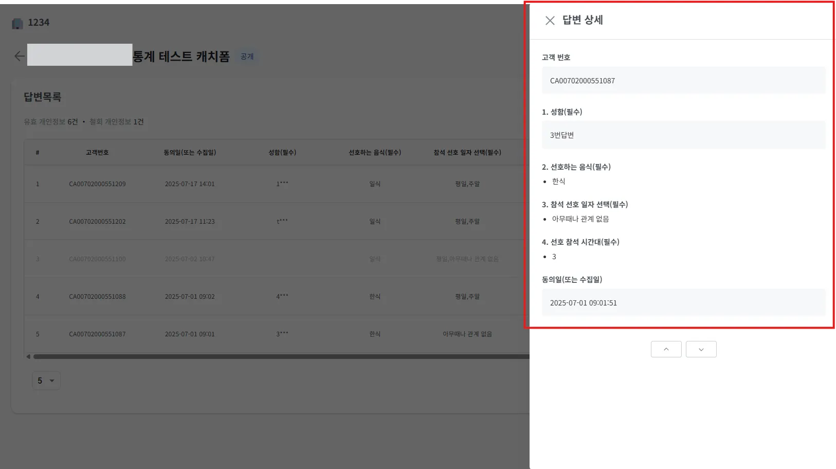 해당 답변을 클릭하면, 각 정보주체의 캐치폼 응답 내역을 모두 확인할 수 있습니다.