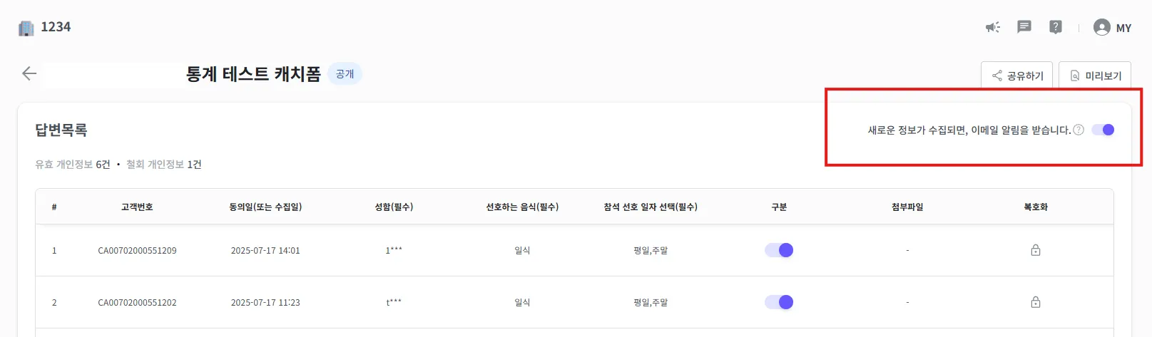 초대 수락 후 캐치폼명을 클릭하면 해당 캐치폼에 수집된 개인정보 세부 항목을 열람할 수 있습니다.