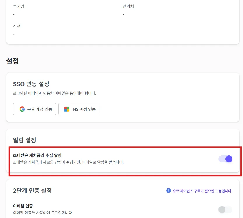 마이 페이지 하단 > 알림 설정 > 초대받은 캐치폼의 수집 알림 기능을 ‘ON’ 설정합니다.