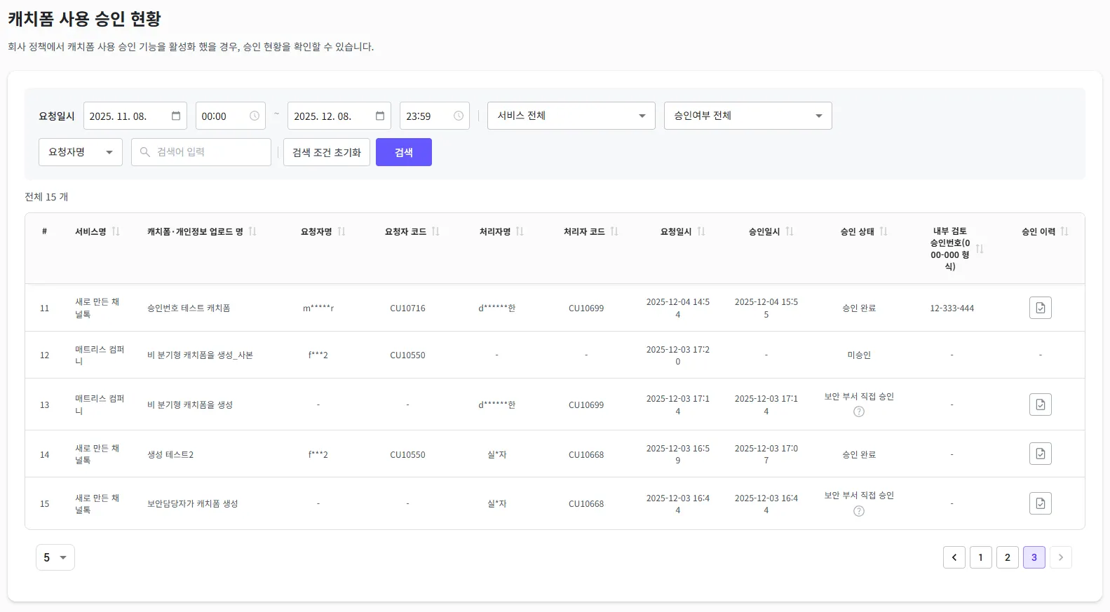 경로:메뉴 > 개인정보 모니터링 > 캐치폼 사용 승인 현황