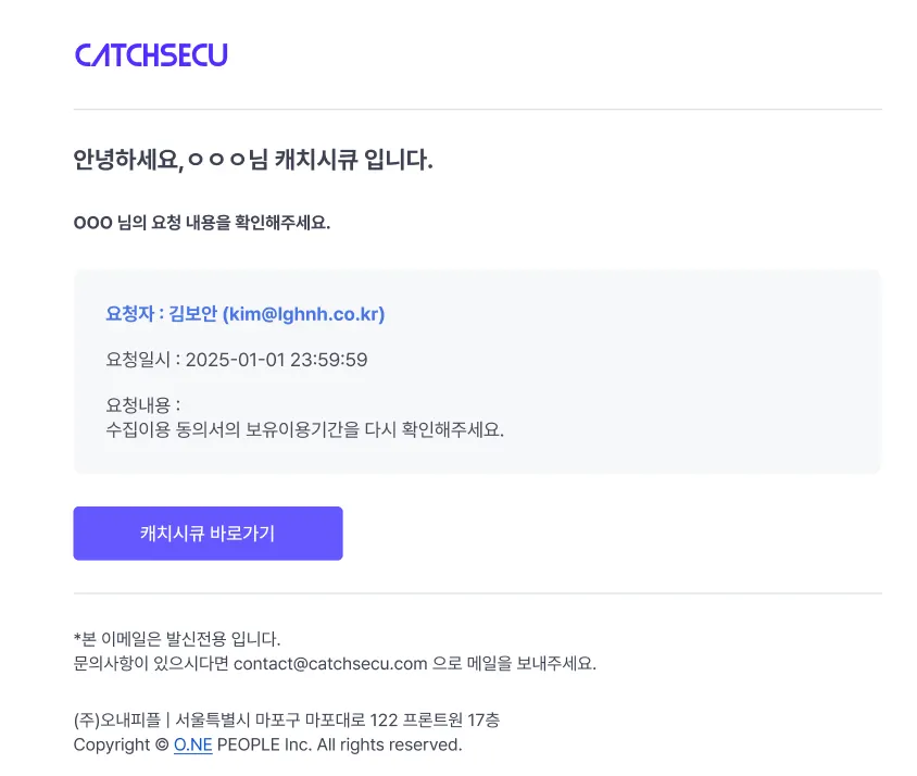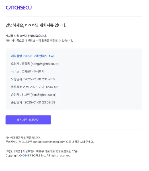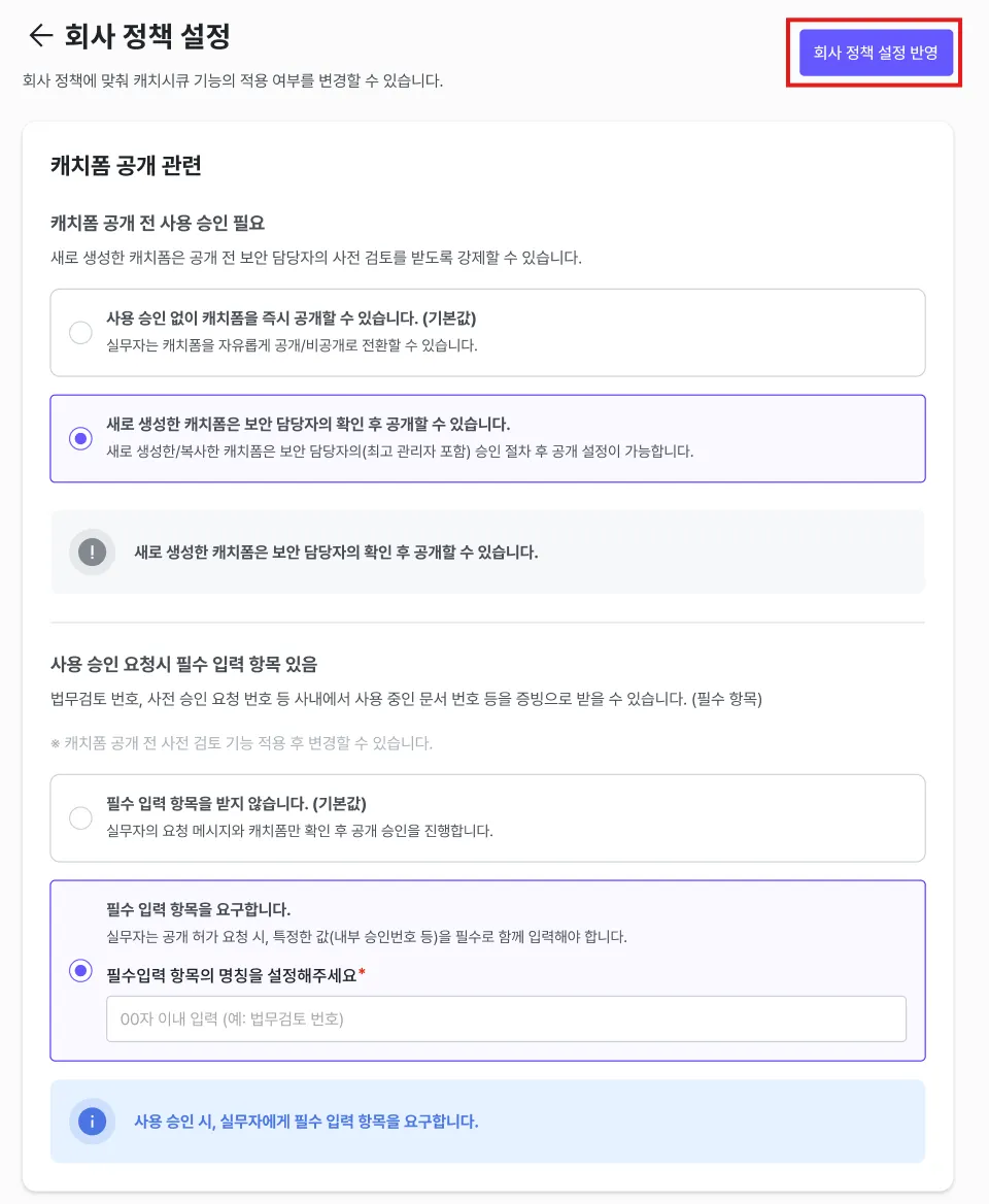 필수 입력 항목을 요구함: 실무자가 승인 요청 시 필수값 항목을 입력해야만 요청이 가능하도록 설정합니다. 예를 들어, 캐치폼 사용을 위한 사전 검토를 받았다는 사내 관리 번호 또는 법무검토 번호 등을 요구할 수 있습니다.