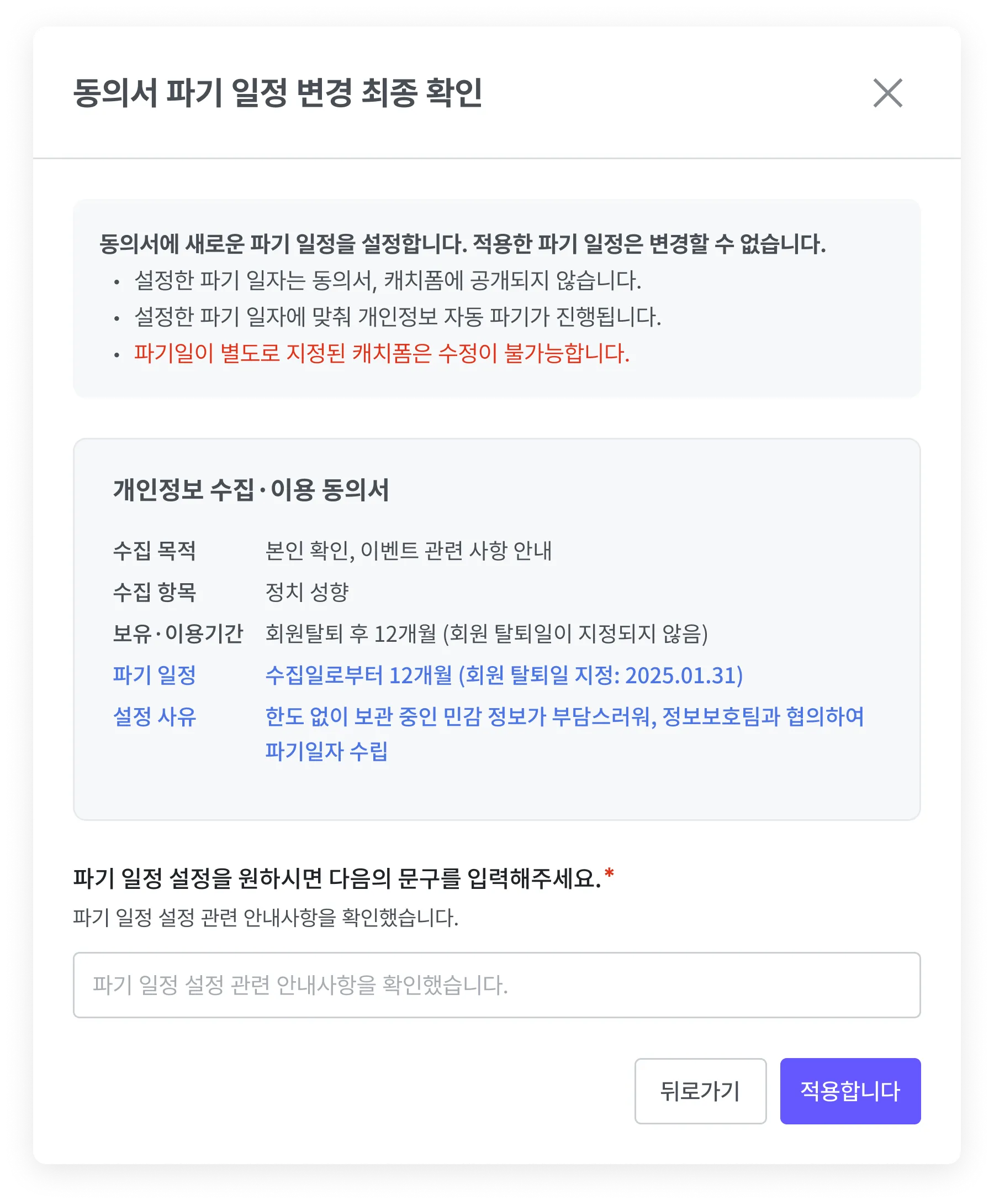 파기 일자는 최초 1회만 설정할 수 있으며, 설정 후 수정이 불가능합니다. 신중하게 일자를 지정해 주세요.