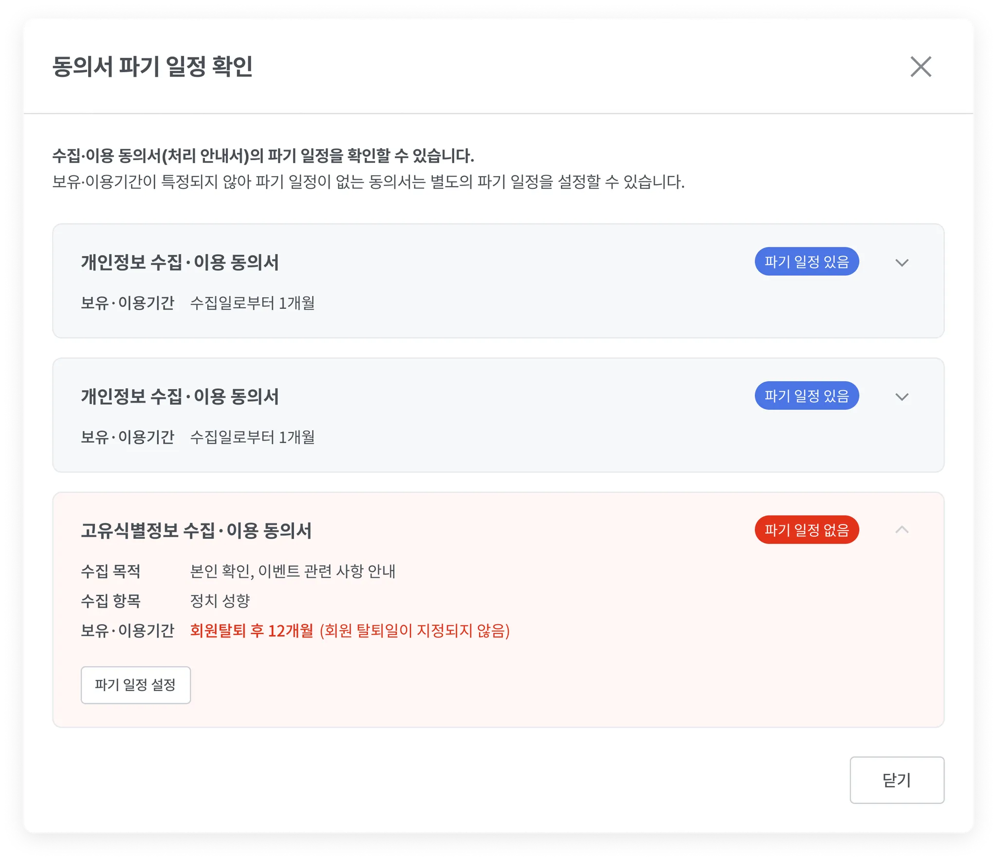 모든 동의서의 파기 일자가 이미 특정되어 있다면, 버튼은 노출되지 않습니다.