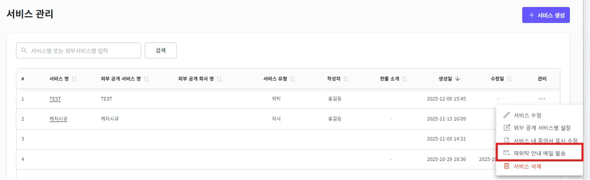 ํด๋นํ๋ ์ํ ์๋น์ค ์ค๋ฅธ์ชฝ โ๊ด๋ฆฌโ 3dot ํด๋ฆญ > [์ฌ์ํ ์๋ด ๋ฉ์ผ ๋ฐ์ก] ํด๋ฆญ