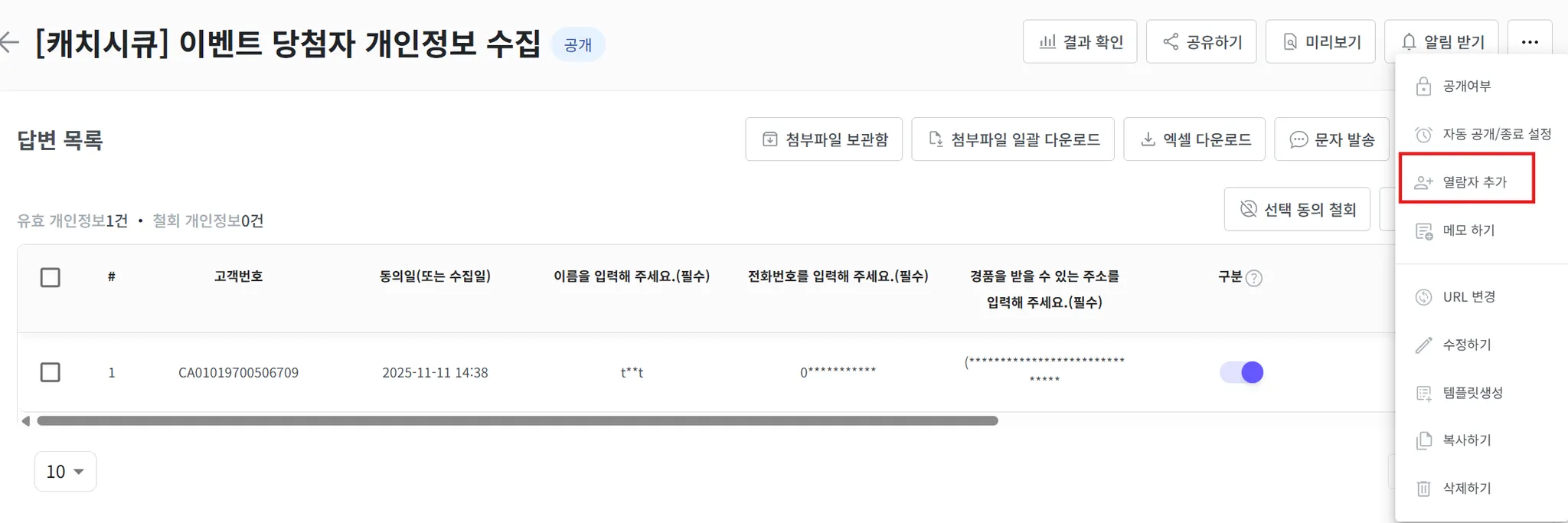 ํ์ผ์ ๋ฉ์ผ๋ก ๋ณด๋ผ ํ์ ์์ด, ํ์ฌ ๋๋ฃ๋ ์ธ๋ถ ํ๋ ฅ์ฌ ๋ฑ ์ง์ ํ ์ฌ์ฉ์์๊ฒ๋ง ํด๋น ์บ์นํผ์ผ๋ก ์์ง๋ ๊ฐ์ธ์ ๋ณด๋ฅผ '์ฝ๊ธฐ ์ ์ฉ' ๊ถํ์ผ๋ก ์์ ํ๊ฒ ๊ณต์ ํ ์ ์์ต๋๋ค.