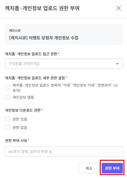 ๊ฒฝ๋ก: ๋ฉ๋ด > ๊ด๋ฆฌ > ๊ถํ ๊ด๋ฆฌ > ํด๋น ์๋น์ค ๋ด ์บ์นํผ ์ ํ > [๊ถํ ๋ถ์ฌ] ํด๋ฆญ