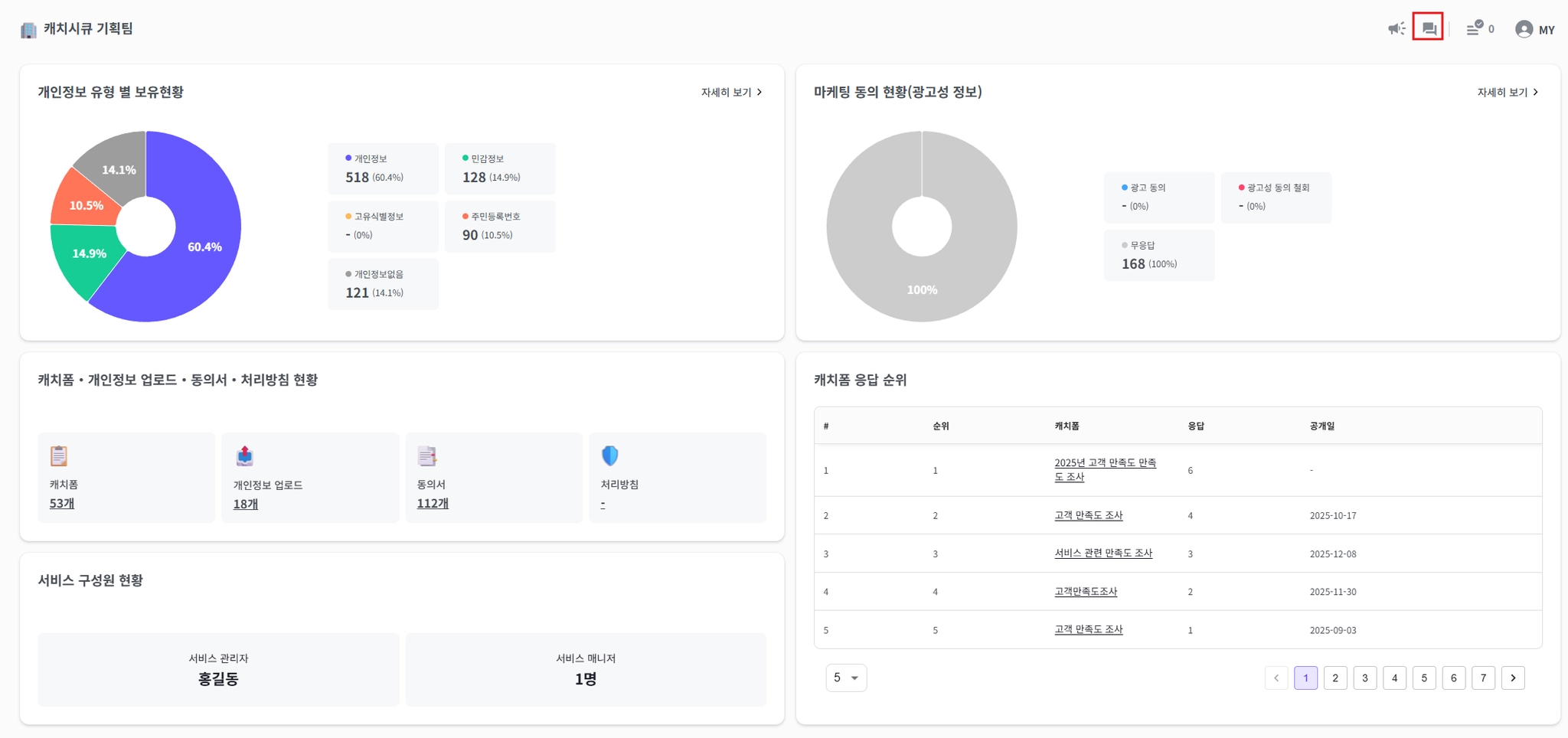 대시보드 우측 상단 “말풍선” 아이콘을 클릭해 주세요.