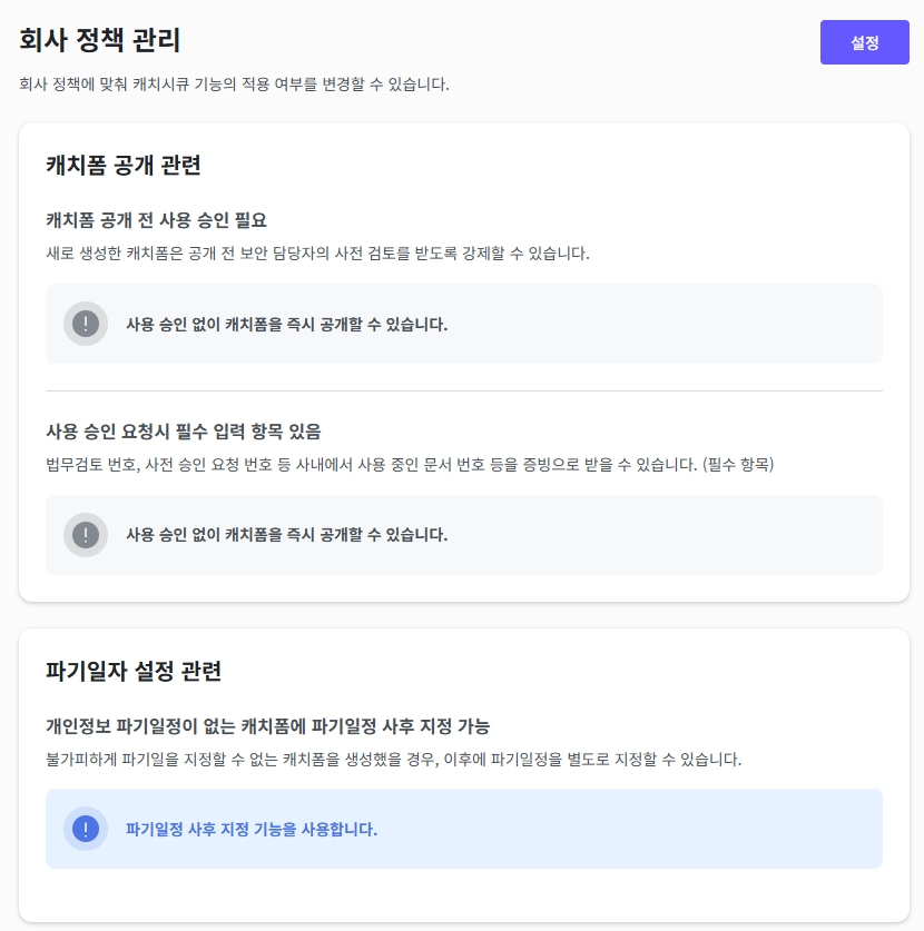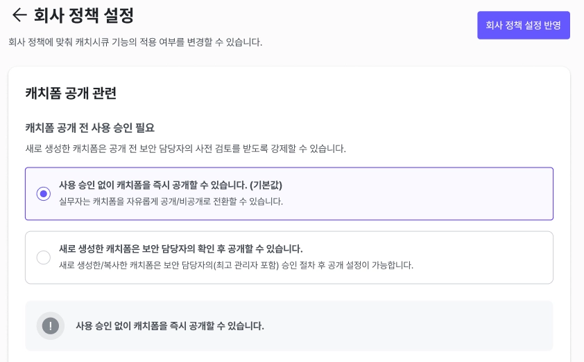 다시 승인 정책을 설정할 경우, 정책 적용 이후에 생성된 캐치폼에 정책이 적용됩니다.