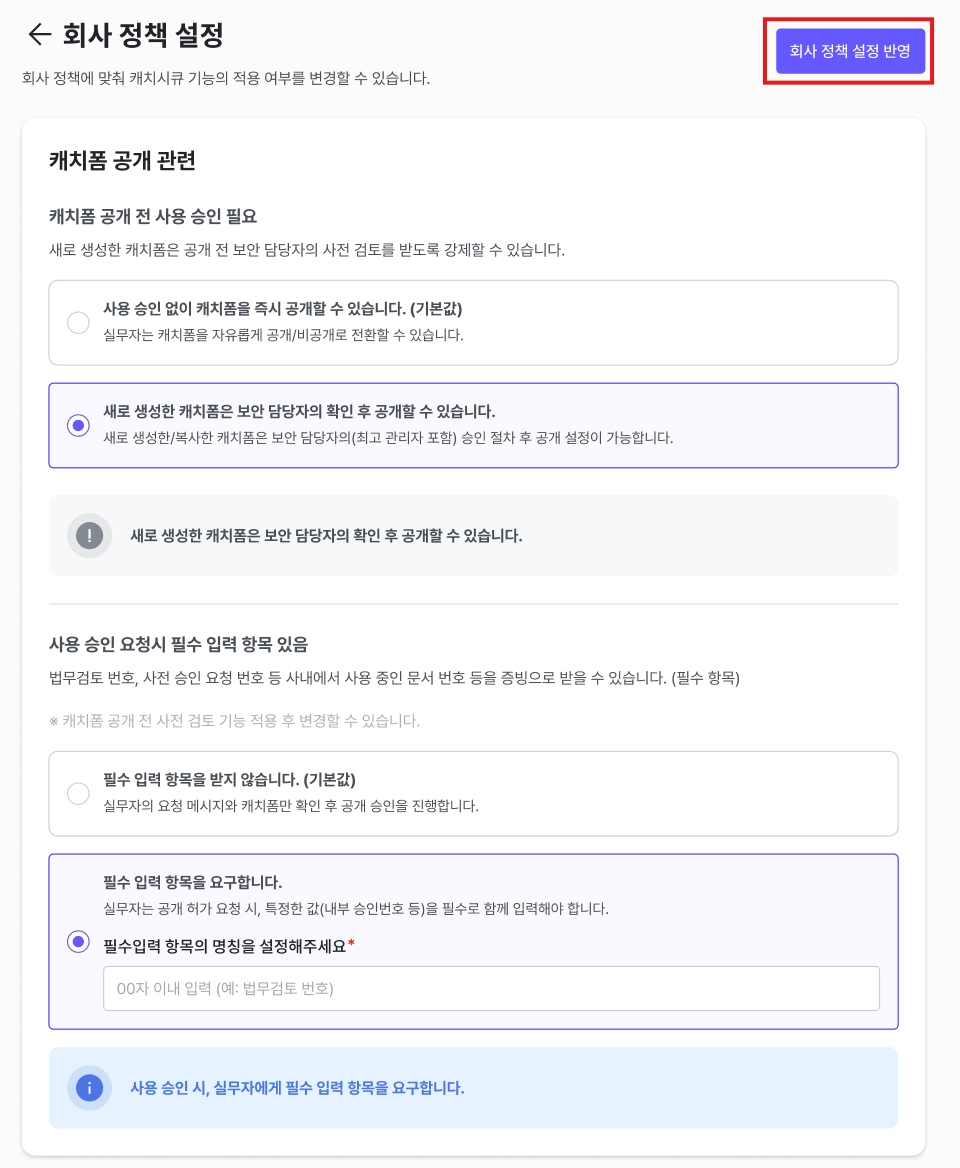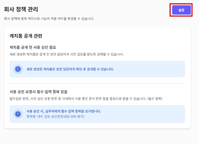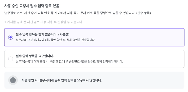 필수 입력 항목을 요구함: 실무자가 승인 요청 시 필수값 항목을 입력해야만 요청이 가능하도록 설정합니다. 예를 들어, 캐치폼 사용을 위한 사전 검토를 받았다는 사내 관리 번호 또는 법무검토 번호 등을 요구할 수 있습니다.