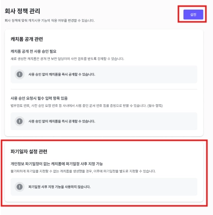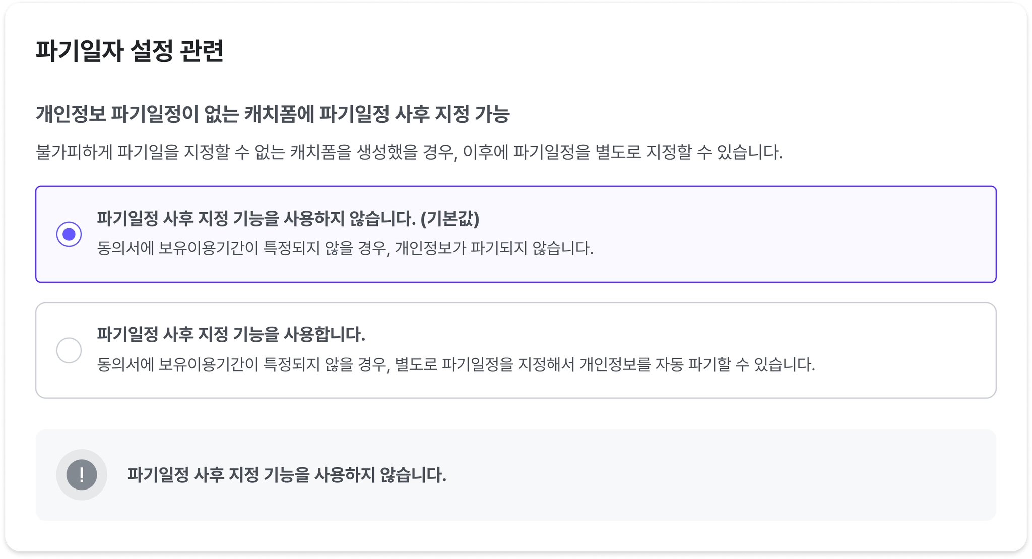 개인정보 파기일정이 없는 캐치폼에 파기일정 사후 지정 가능 여부를 설정 할 수 있습니다.