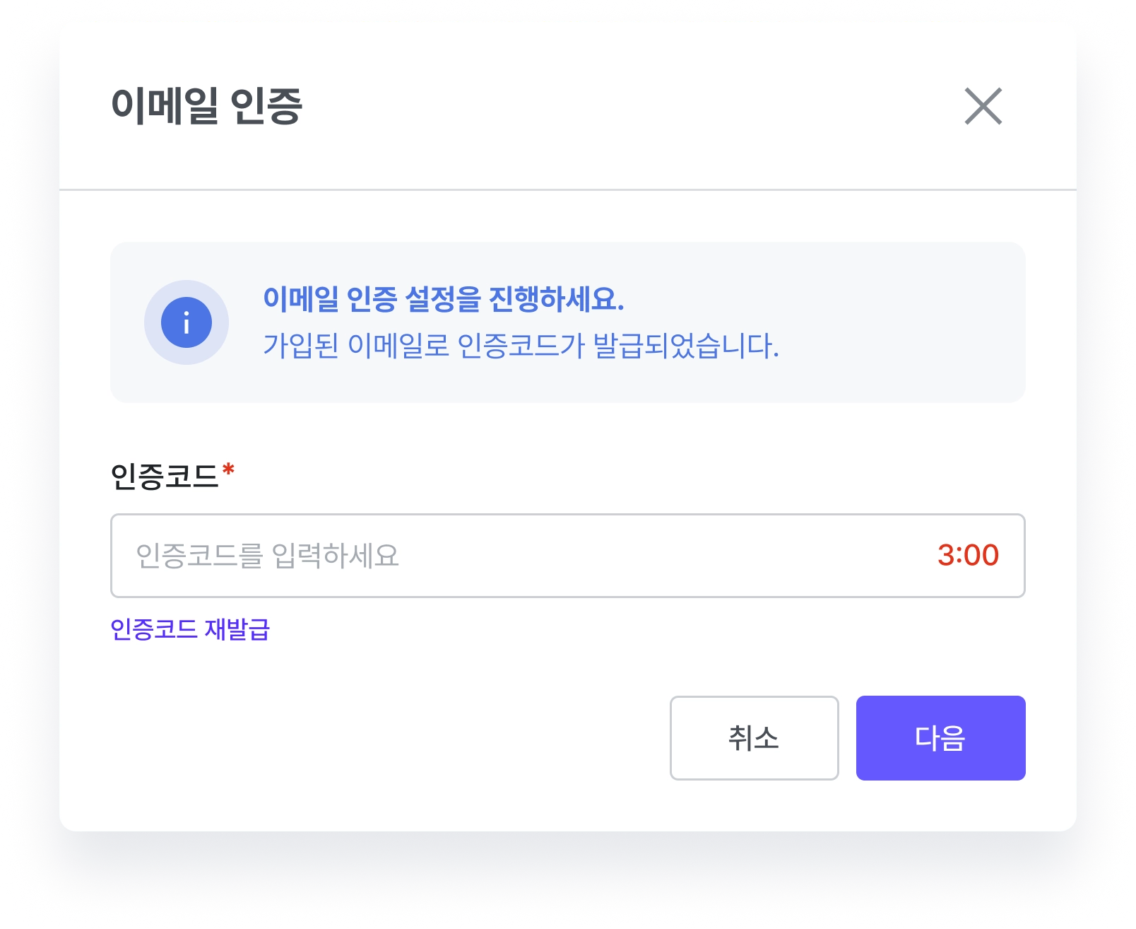 설정 화면 진입을 위해 이메일 2차 인증을 요구합니다.