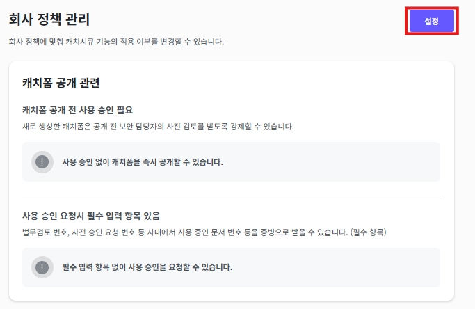 회사 정책 관리 메뉴를 통해 승인 프로세스 도입 여부를 설정할 수 있습니다