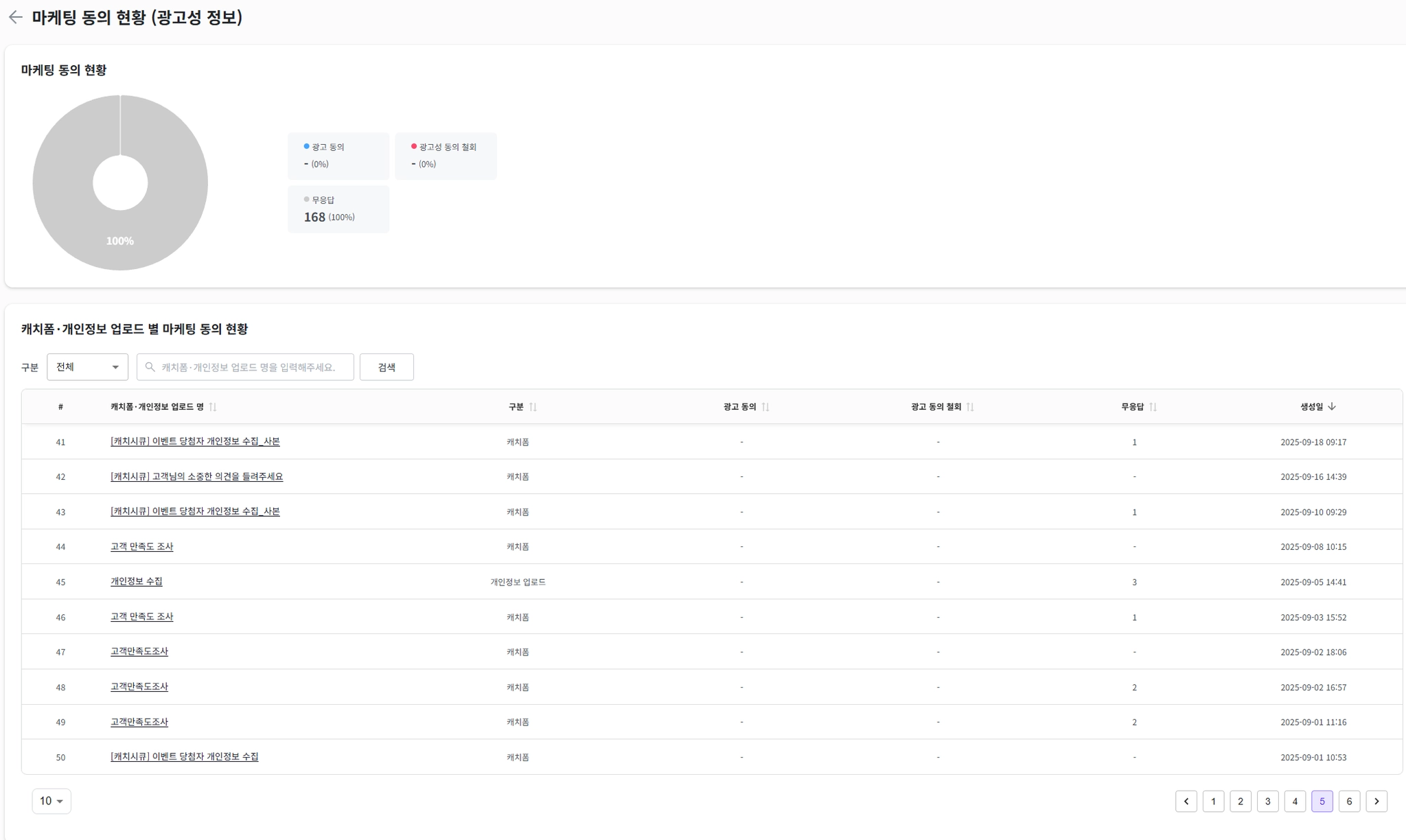 상세 페이지 하단의 목록에서는 개별 ‘캐치폼’ 및 ‘개인정보 업로드’ 건별로 마케팅 동의 현황을 볼 수 있습니다.