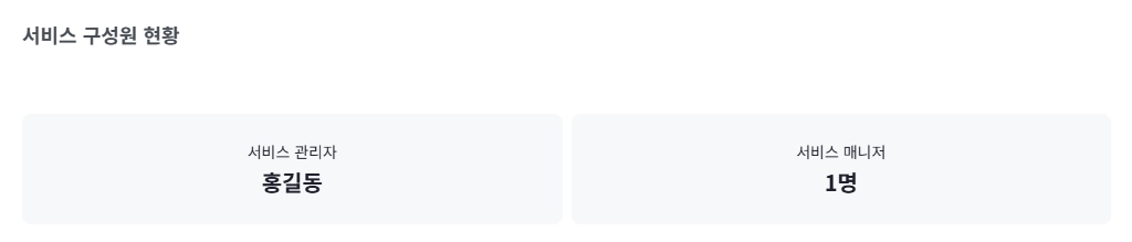 현재 서비스를 운영하고 있는 서비스 관리자와 실무 담당자(서비스 매니저)의 등록 현황을 확인할 수 있습니다.