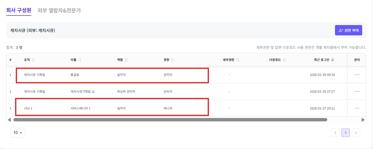서비스 내에 모든 개인정보에 권한을 받거나, 특정 캐치폼에 대한 열람/ 다운로드 권한 같은 세부 권한 지정도 가능합니다.