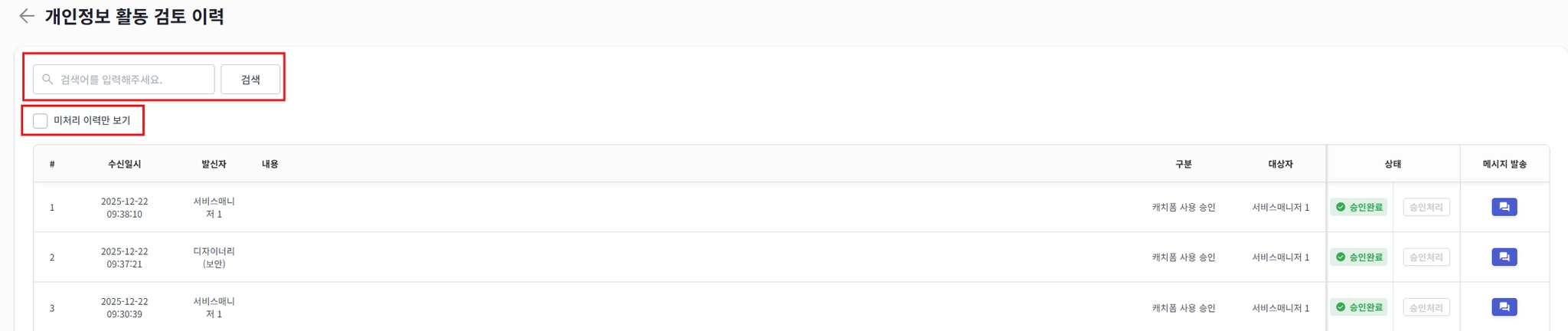 미처리 이력만 보기: 리스트 좌측 상단의 체크박스를 선택하면, 아직 승인되지 않은('미승인') 항목만 필터링하여 우선적으로 업무를 처리할 수 있습니다.