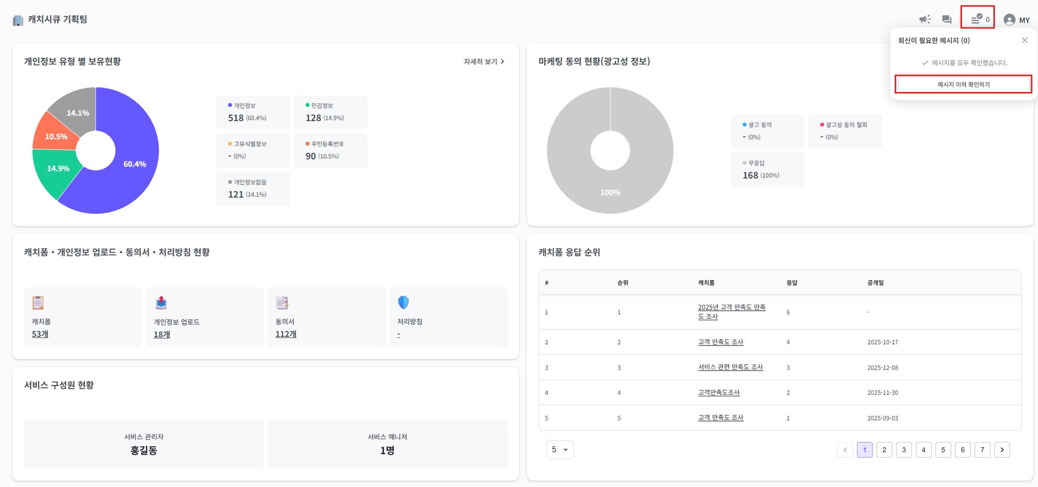 서비스 내에서 발생하는 개인정보 취급 관련 요청(승인) 내역을 실시간으로 확인하고,