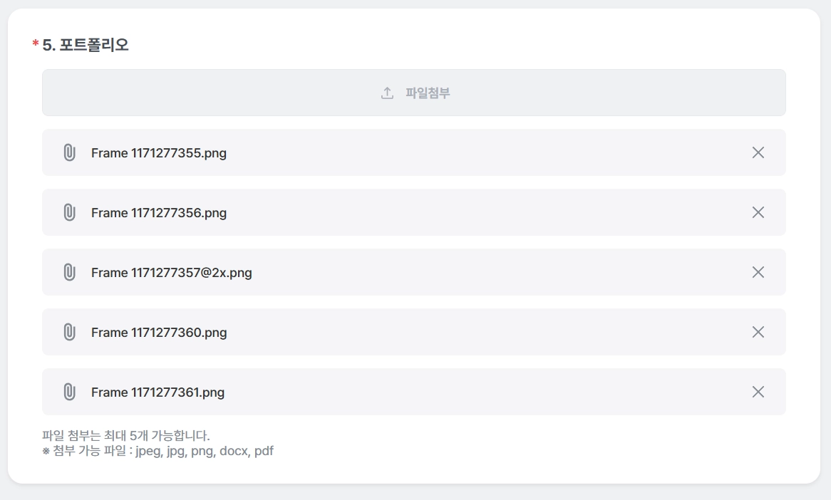 설정값에 따라 문항 1개에 최대 5개의 파일을 첨부 받을 수 있습니다.
