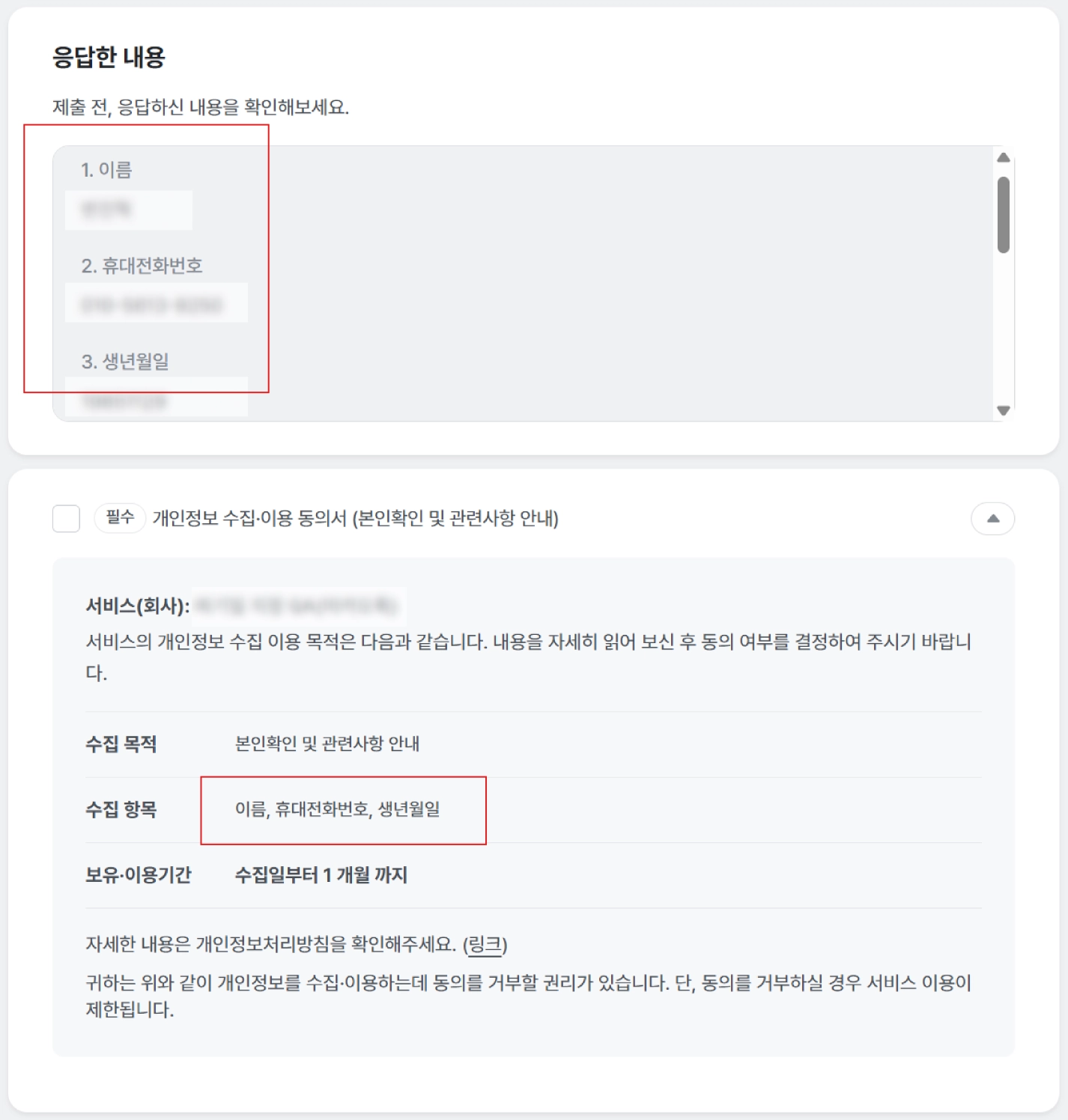 문항 응답이 완료되면 마지막 단계에서 개인정보 수집/이용 또는 제공에 대한 동의(또는 동의 근거 안내)를 진행합니다.