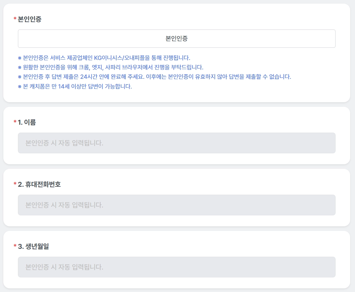 본인인증 받은 개인정보를 수집할 수 있습니다. 본인인증 기능은 유료로 제공됩니다. 정보주체가 본인인증 답변 시도 시, 회사 내 보유중인 본인인증 부가서비스 잔여 수량을 자동으로 배정합니다.