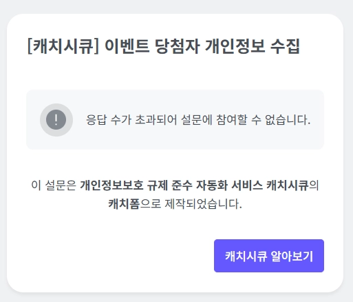 설정된 최대 응답자 수에 도달하면, 이후 설문에 접속하는 사용자에게는 ‘설문 참여가 마감되어 참여할 수 없습니다’라는 내용의 팝업이 표시됩니다.