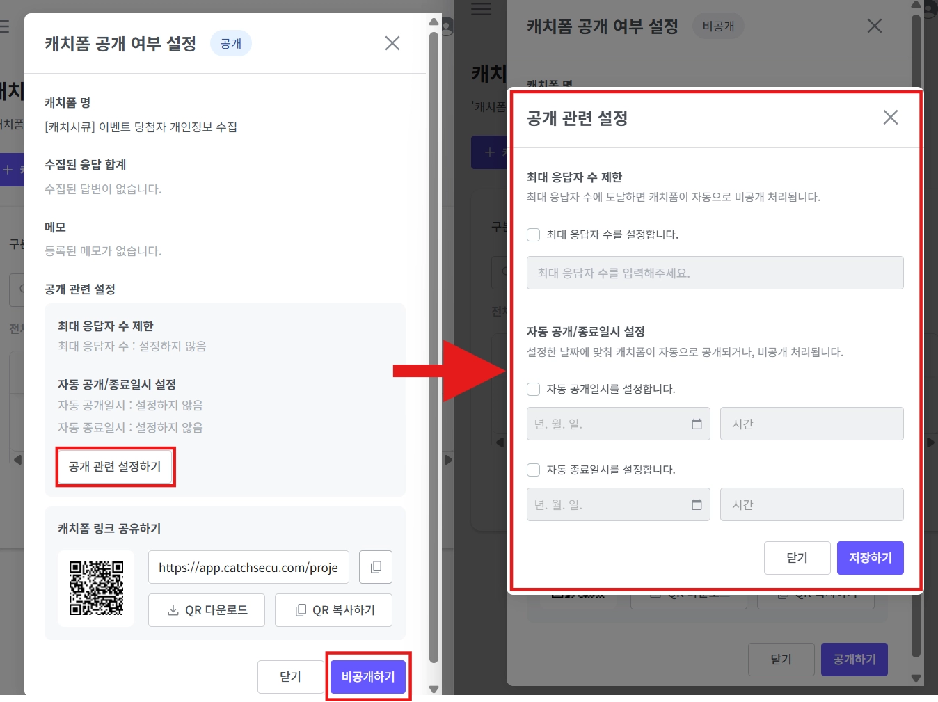 캐치폼 생성 시 설정했던 공개 여부를 변경할 수 있으며, 이 설정은 캐치폼 비공개 상태에서만 가능합니다.