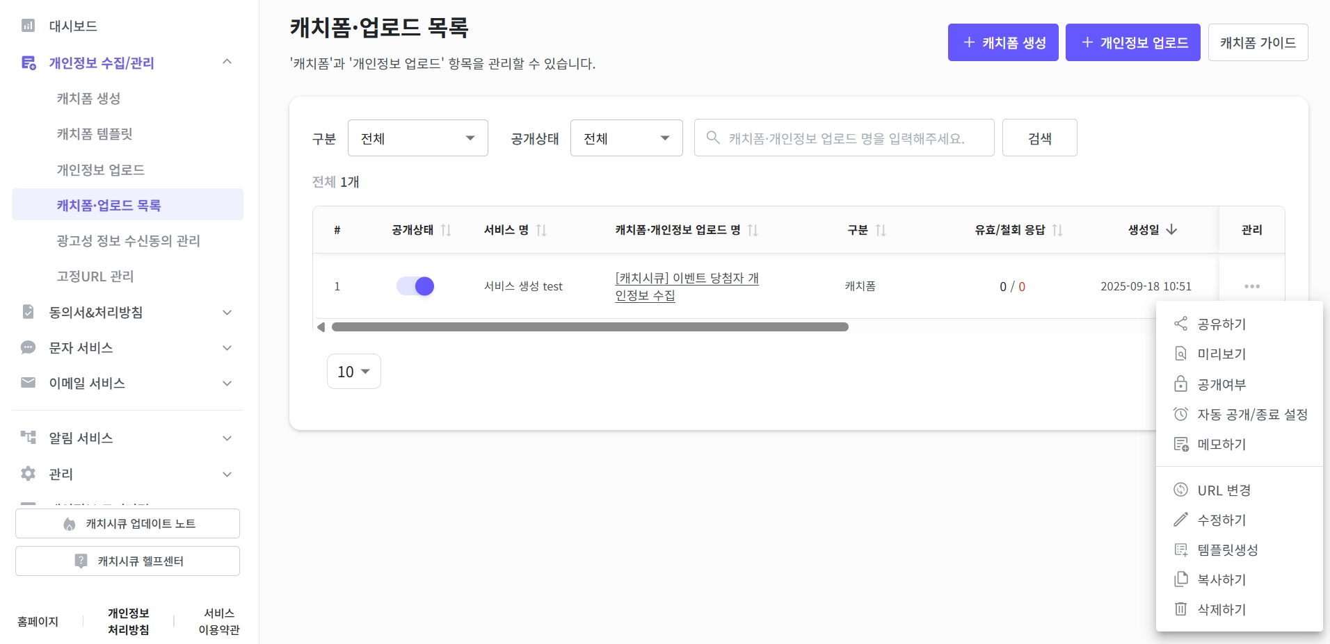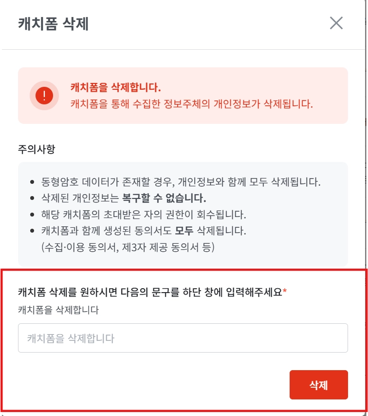 동의서 삭제: 캐치폼과 함께 생성된 모든 동의서 (수집-이용 동의서, 제3자 제공 동의서 등)도 함께 삭제됩니다.